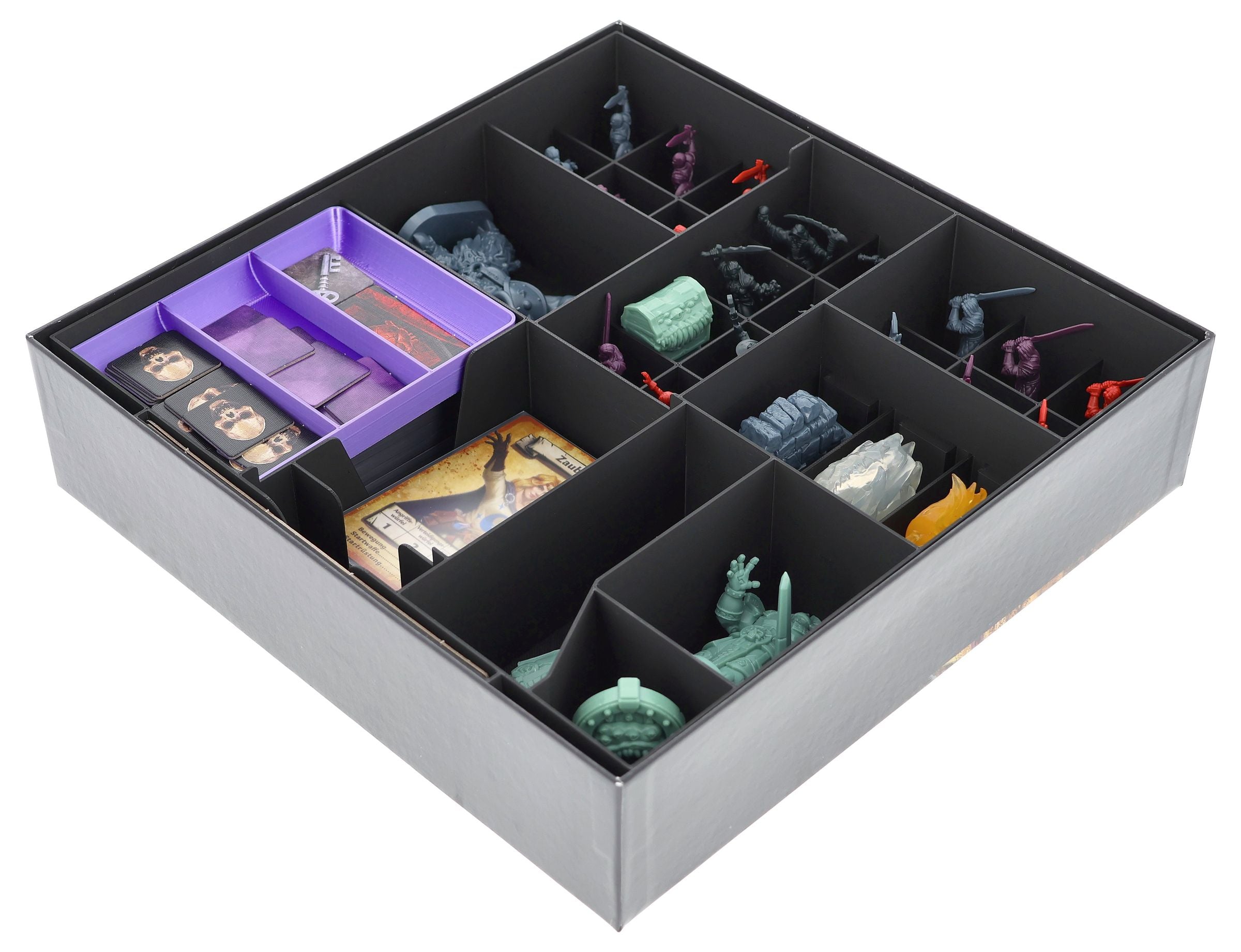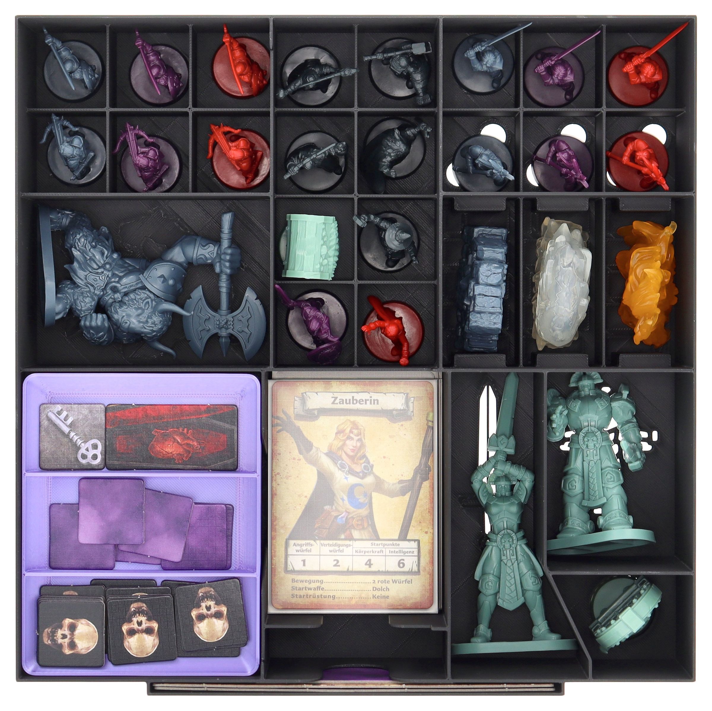 • Custom-designed compartments keep miniatures, cards, tokens, and tiles neatly organized and ensure quick setup.