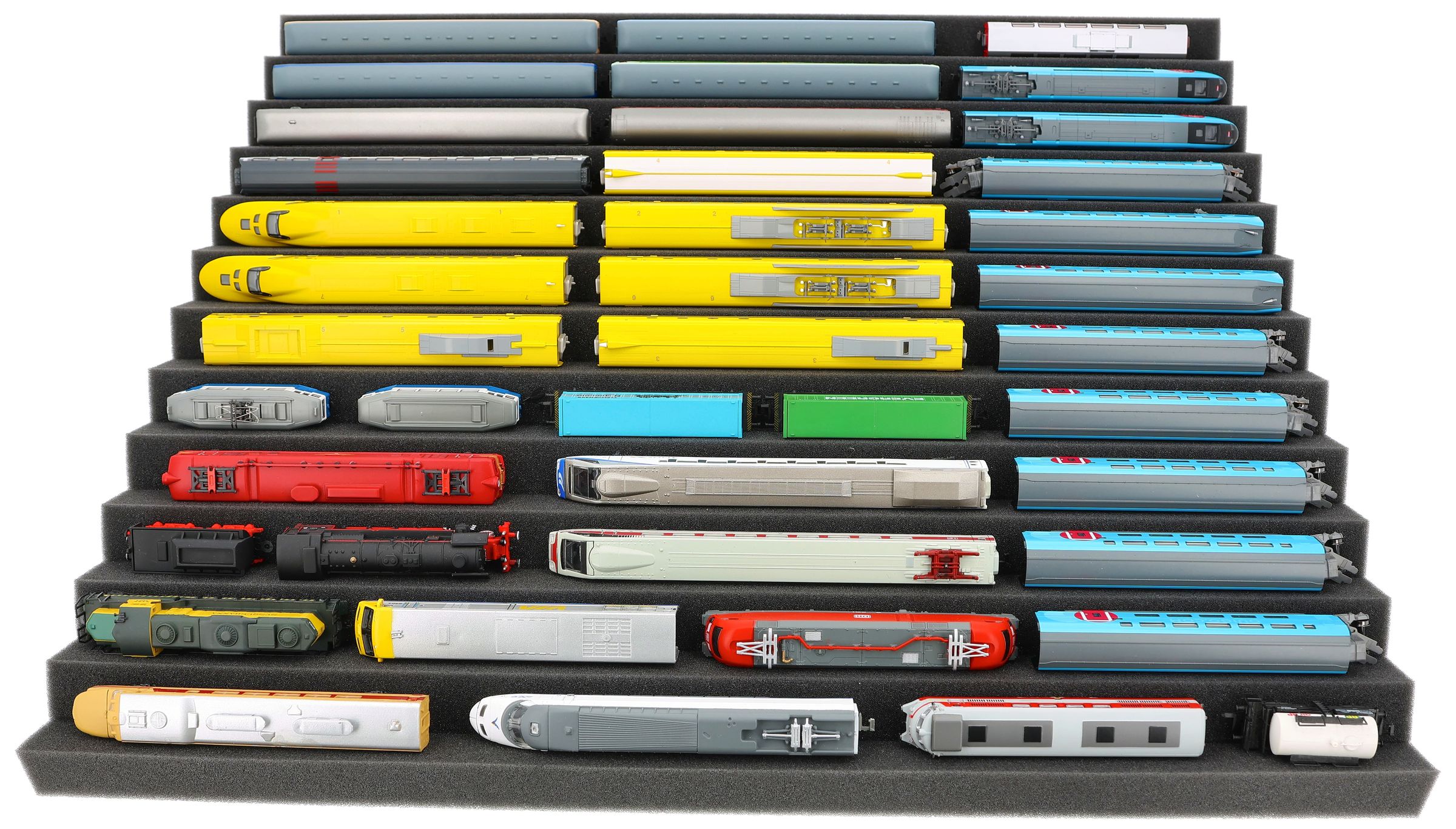 Universelle Zick-Zack Schaumstoffmatte zur sicheren und ordentlichen Aufbewahrung von Modelleisenbahnen in Spurweite N - immer die passende Größe zuschneidbar.