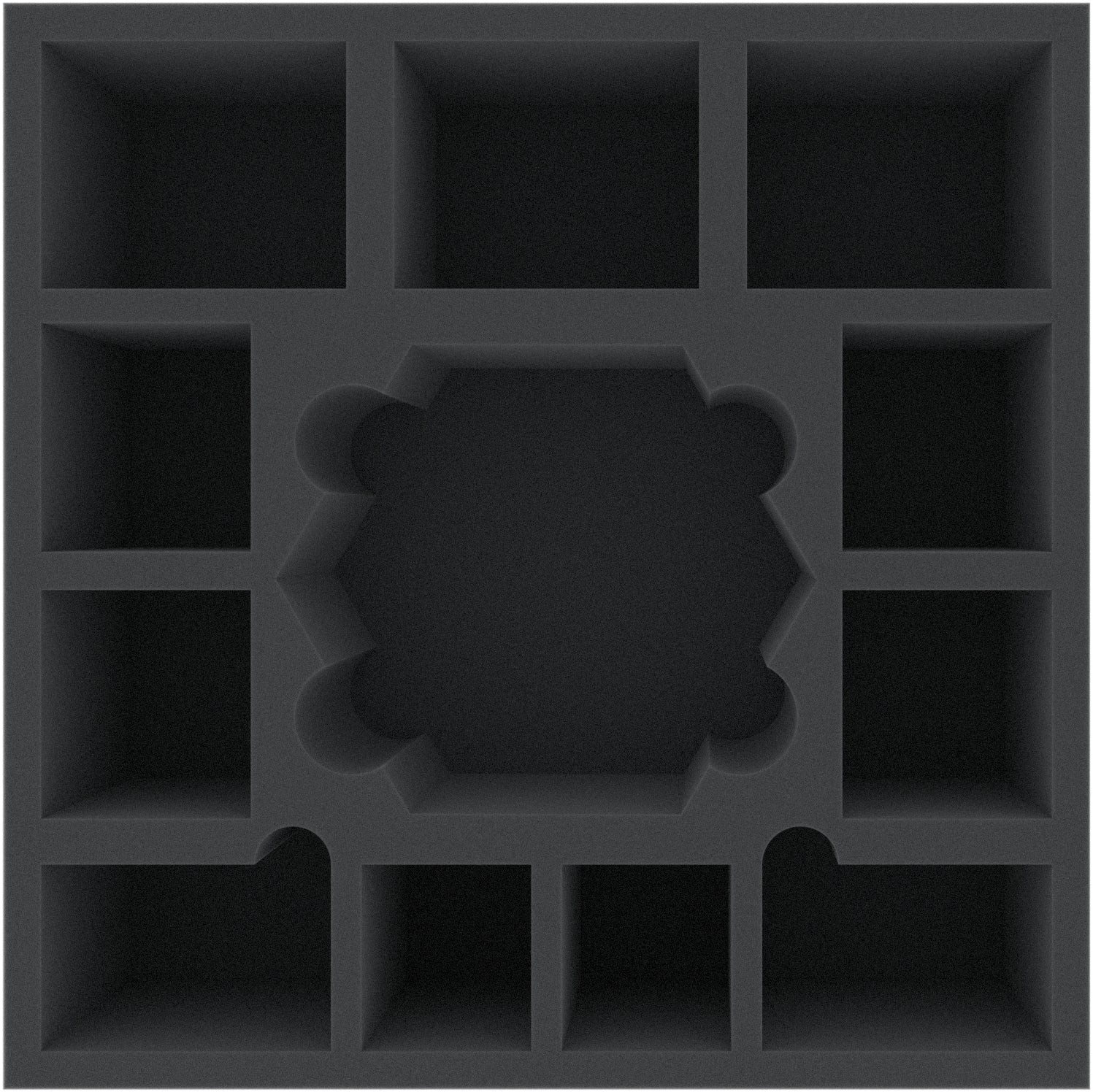 Diese Schaumstoffeinlage ist unterteilt in 12 unterschiedlich große Fächer. Sie eignet sich besonders gut, um größere Miniaturen, gemeinsam mit Spielmaterial, sicher aufzubewahren. 2 Fächer können als Kartenfächer genutzt werden, das große Fach in der Mitte ist ideal für sechseckige Tiles.