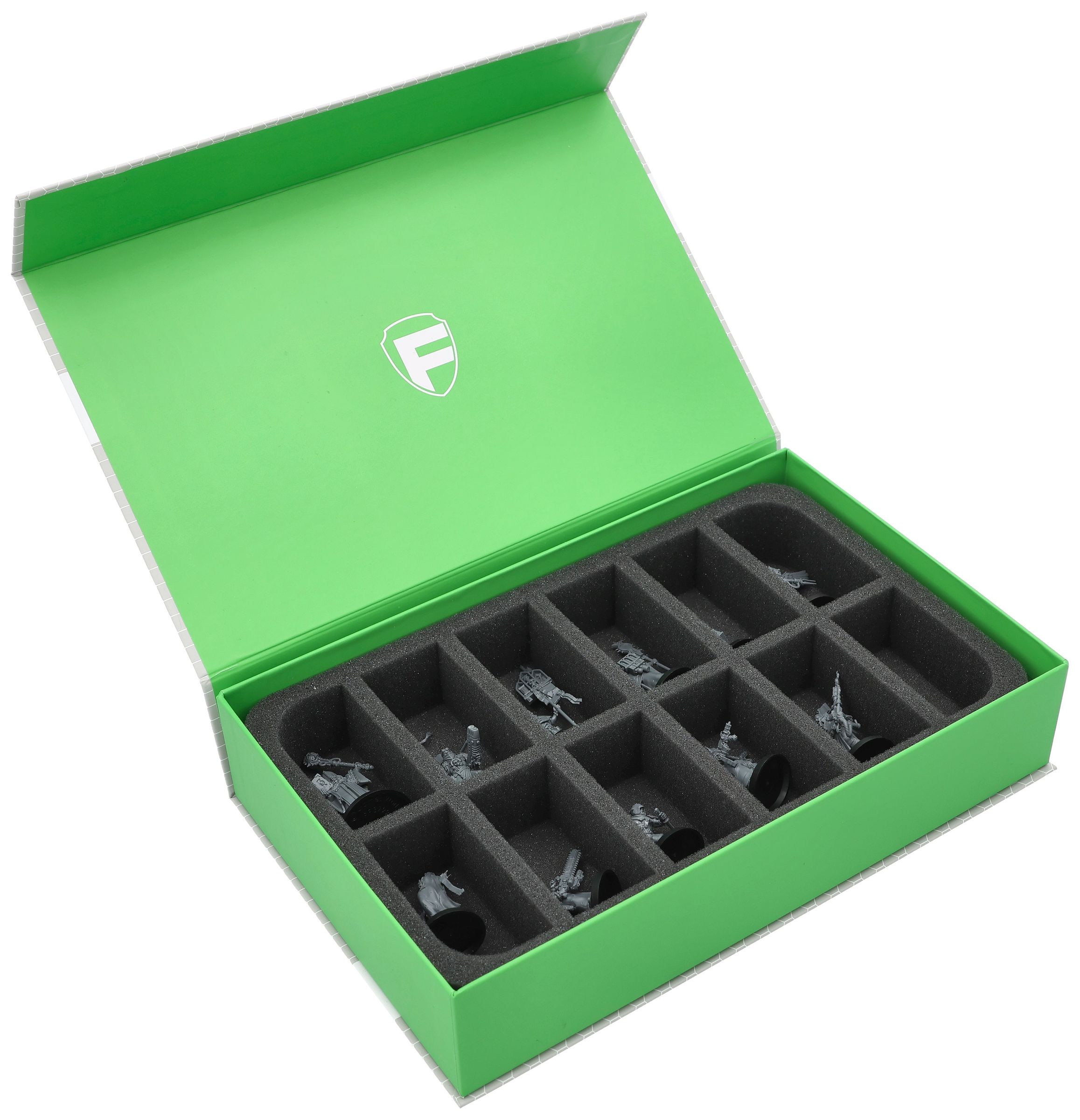 In dieser robusten Magnetbox grün inklusive maßgeschneiderter Feldherr Schaumstoffeinlage sind deine Sanktifikatoren aus dem Kill Team: Inbrunst und Blut Streitmacht Starter-Set bestens geschützt.