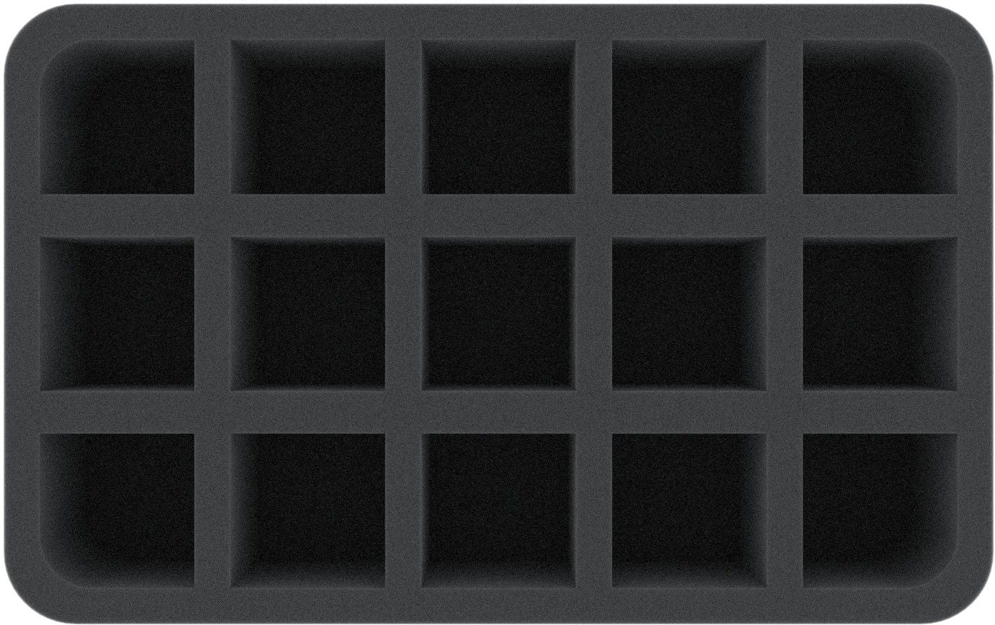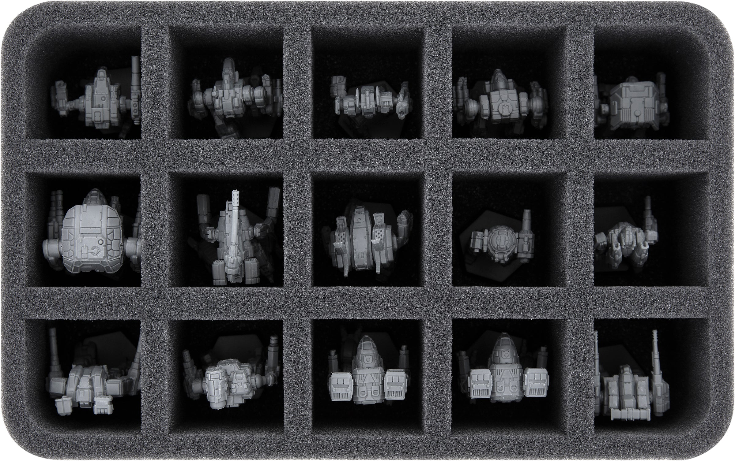 Diese Schaumstoffeinlage eignet sich mit ihren 15 gleich großen Fächern hervorragend um deine BattleTech-Miniaturen übersichtlich und bestens geschützt aufzubewahren.