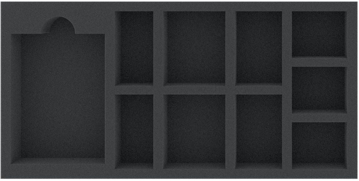 Diese 35 mm hohe Schaumstoffeinlage ist unterteilt in 10 Fächer. Sie eignet sich besonders gut zum sicheren Aufbewahren von Tabletop- und Brettspiel-Miniaturen und anderen empfindlichen Modellen und Kleinteilen.