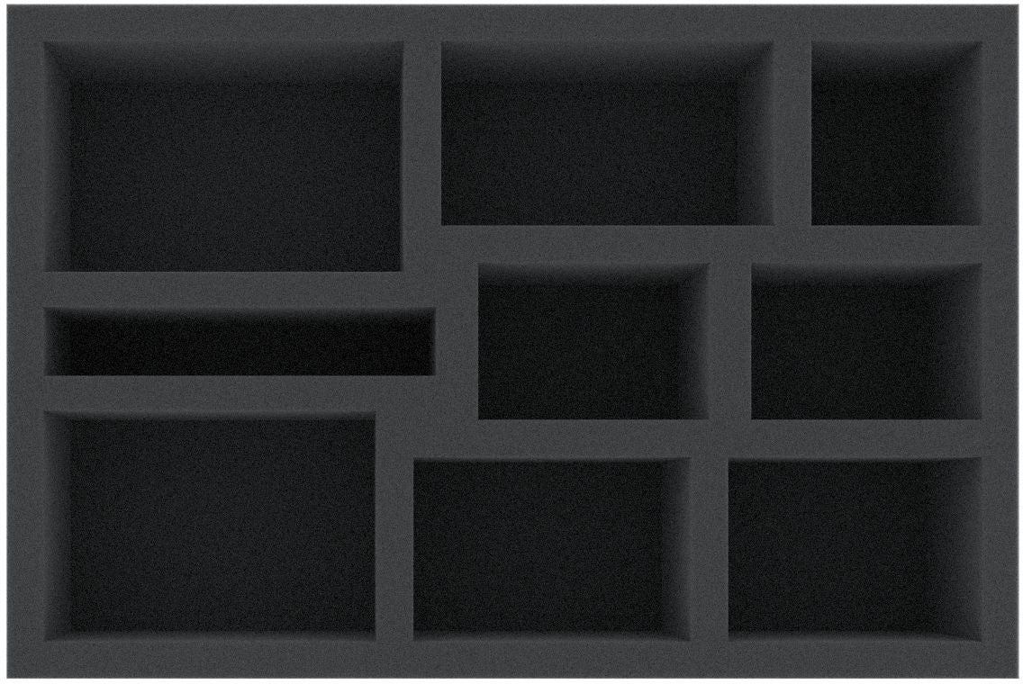 Diese 50 mm hohe Schaumstoffeinlage ist unterteilt in 9 Fächer. Sie eignet sich besonders gut zum sicheren Aufbewahren von Tabletop- und Brettspiel-Miniaturen und anderen empfindlichen Modellen und Kleinteilen.