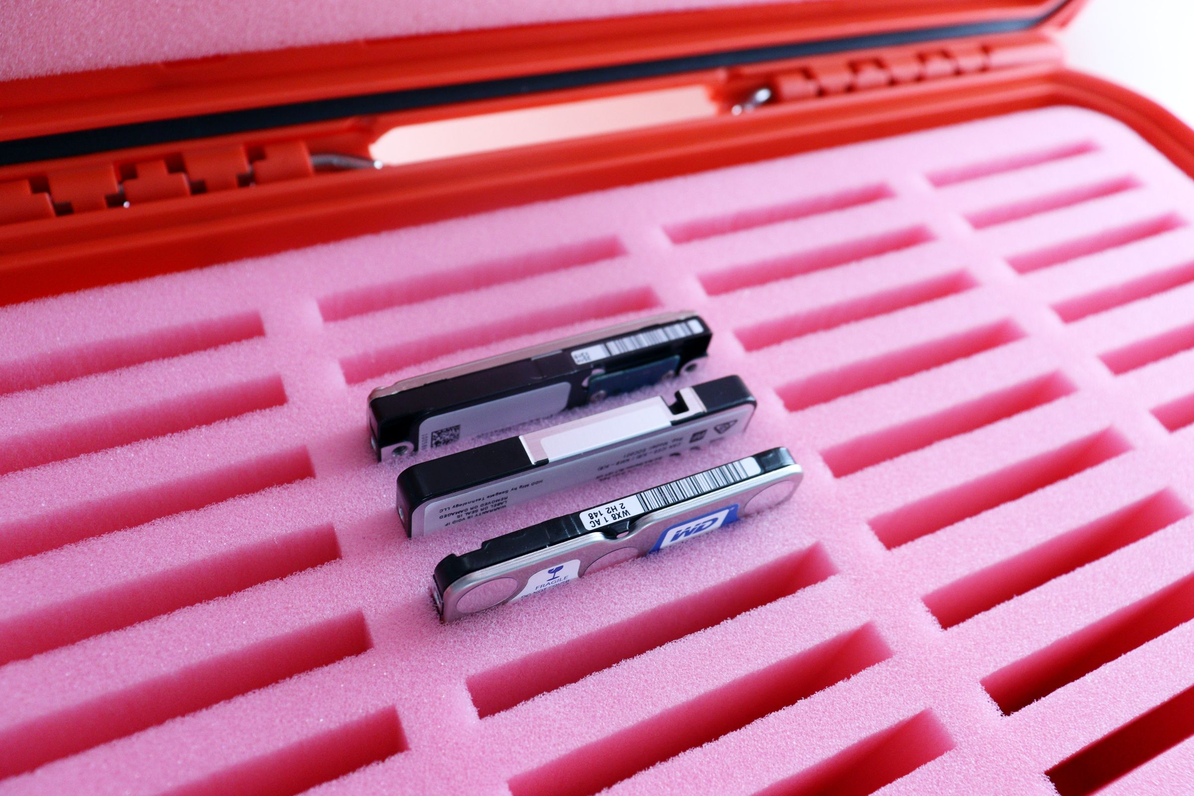 • Jede der 48 Ausstanzungen ist 71 mm lang x 7,5 mm breit x 80 mm tief. Eine 100 mm hohe SSD Platte schaut also leicht aus dem Schaumstoff und lässt sich damit perfekt entnehmen.