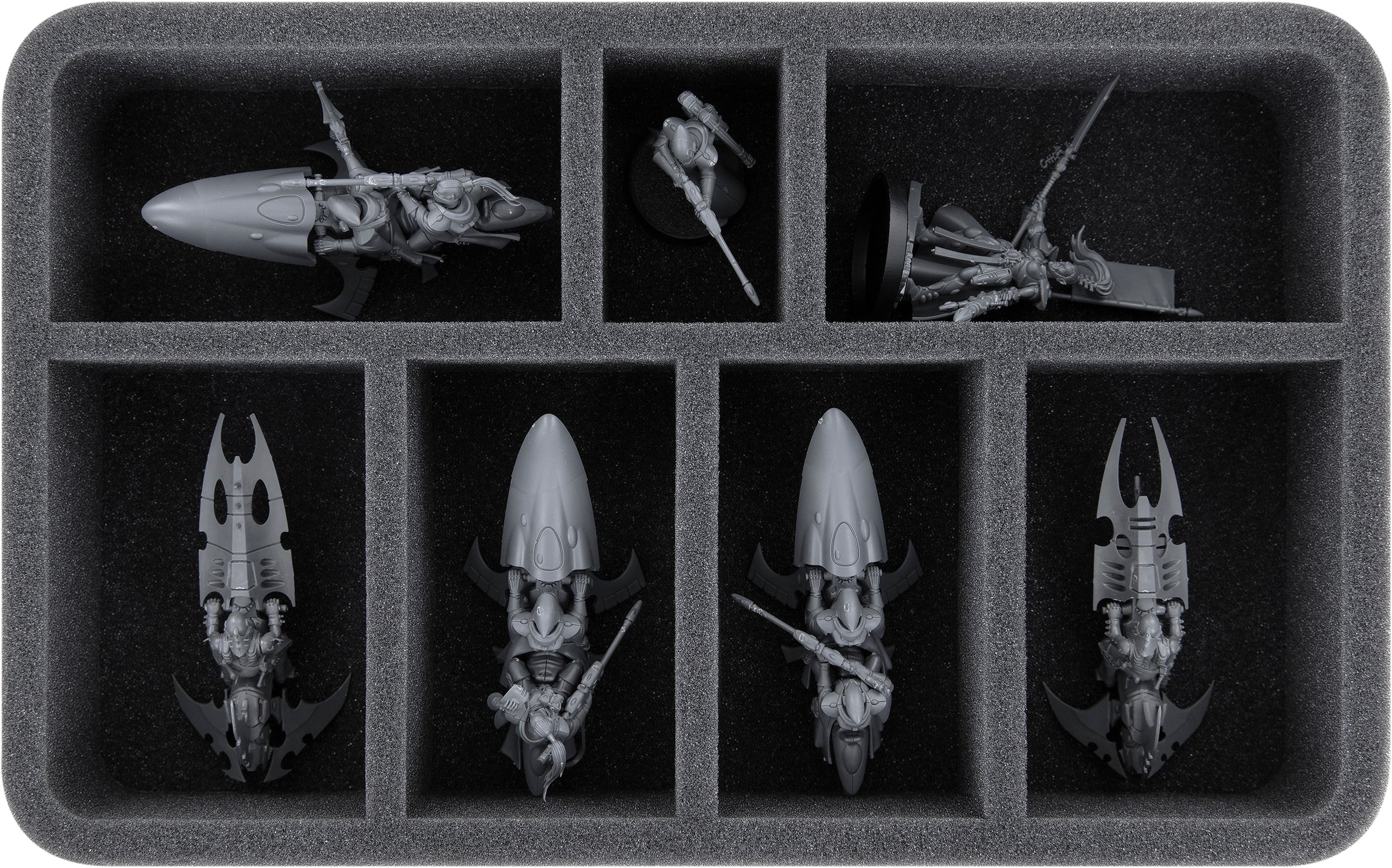- 1 Half-Size Schaumstoffeinlage mit 7 Fächern für Starweaver/Voideaver ohne Flugbase + ausladende Miniaturen wie Shadowseer, Death Jester und Modelle mit ähnlichen Abmessungen + separates Flugbase (HS080A027)