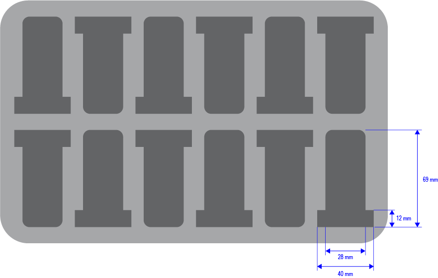 • 12 emplacements : 40/28 mm x 69 mm x 40 mm
