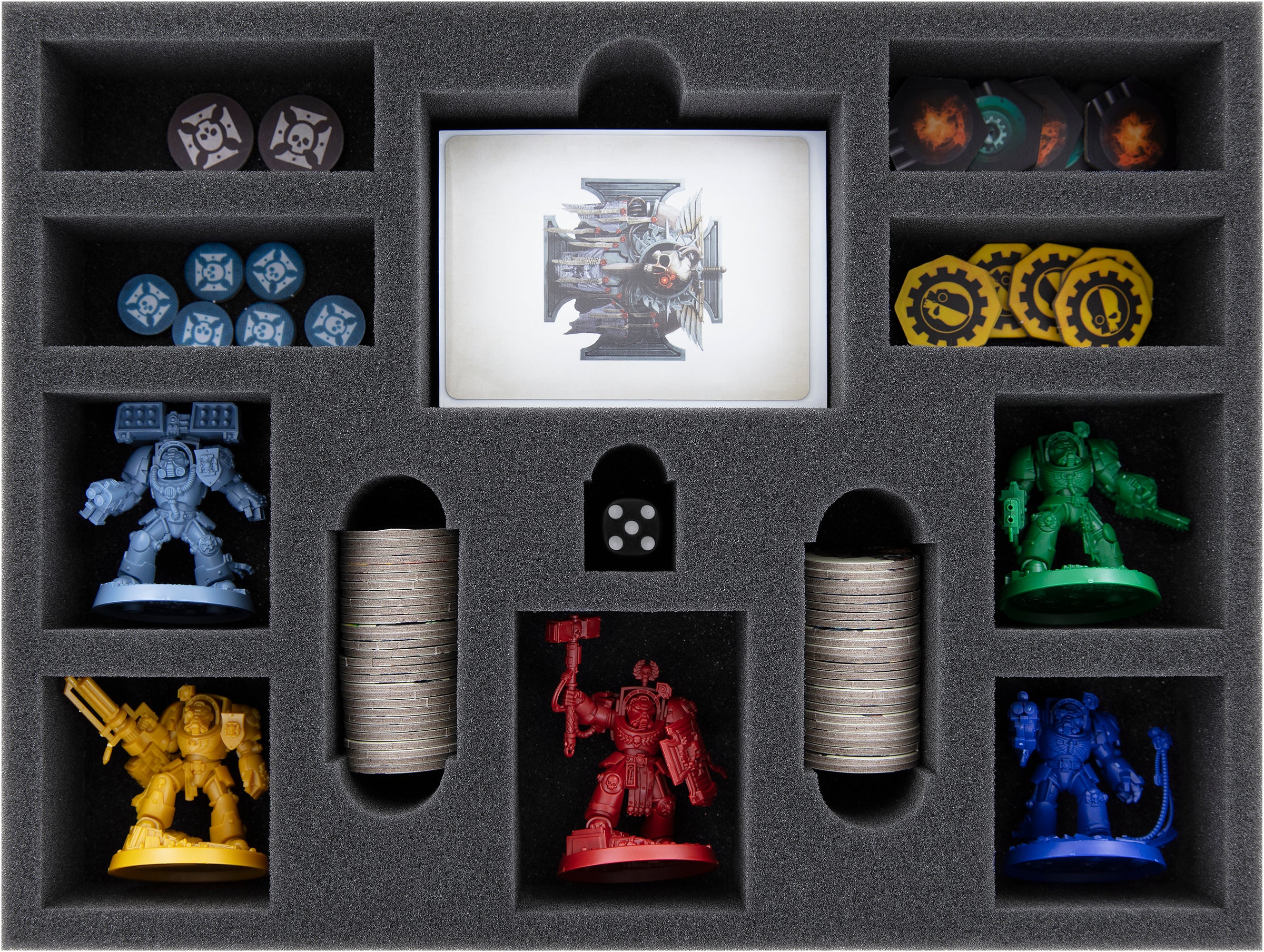 Pour les figurines, vous avez à votre disposition 5 compartiments découpés avec précision. Ceux-ci sont faits sur mesure pour les figurines des Terminators. Le matériau en mousse souple protège le Servo-crâne de Lucian de manière aussi fiable contre les mauvaises surprises que les bolters de ses frères. Les peintures acryliques écaillées ou rayées sur les modèles peints font également partie du passé.