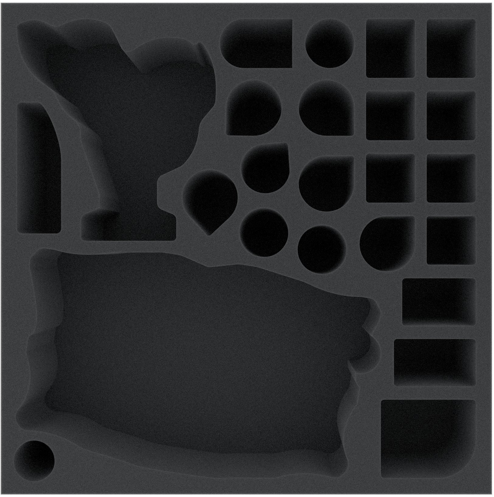 In der 70 mm hohen Einlage stehen deinen Miniaturen aus dem Etherfields Grundspiel, der 5th Player Expansion, dem Thorn Knight Optional Buy und aller freigeschalteten Stretchgoals aus Wave 1 insgesamt 23 Fächer zur Verfügung. Egal ob es sich um den Dreamer oder den Thorn Knight handelt – jede Figur erhält ein passgenaues Fach. Das große Modell von Belshazar bekommt sogar ein miniaturengenau geschnittenes Fach spendiert. Dank des passgenauen Zuschnitts haben deine Miniaturen einen festen Sitz und können nicht verrutschen. Der weiche, feinporige Schaumstoff schützt filigrane Teile vorm Abbrechen und die Farben deiner bemalten Modelle vor Kratzern und Farbabrieb.