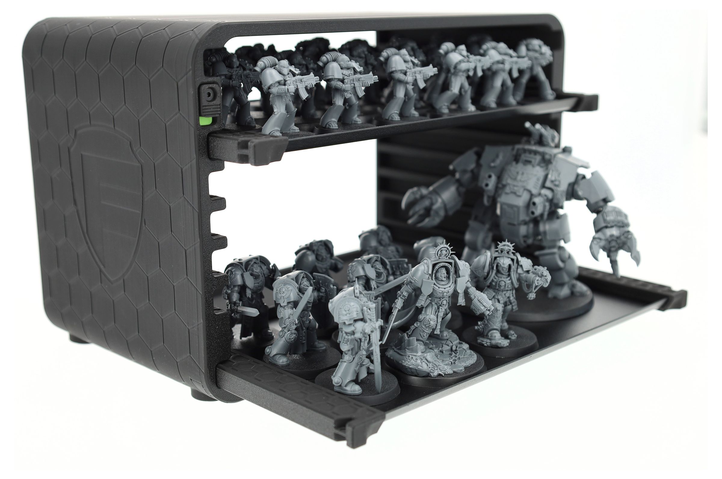 - 7 tray slots for the magnetic trays - flexible layout depending on miniature height