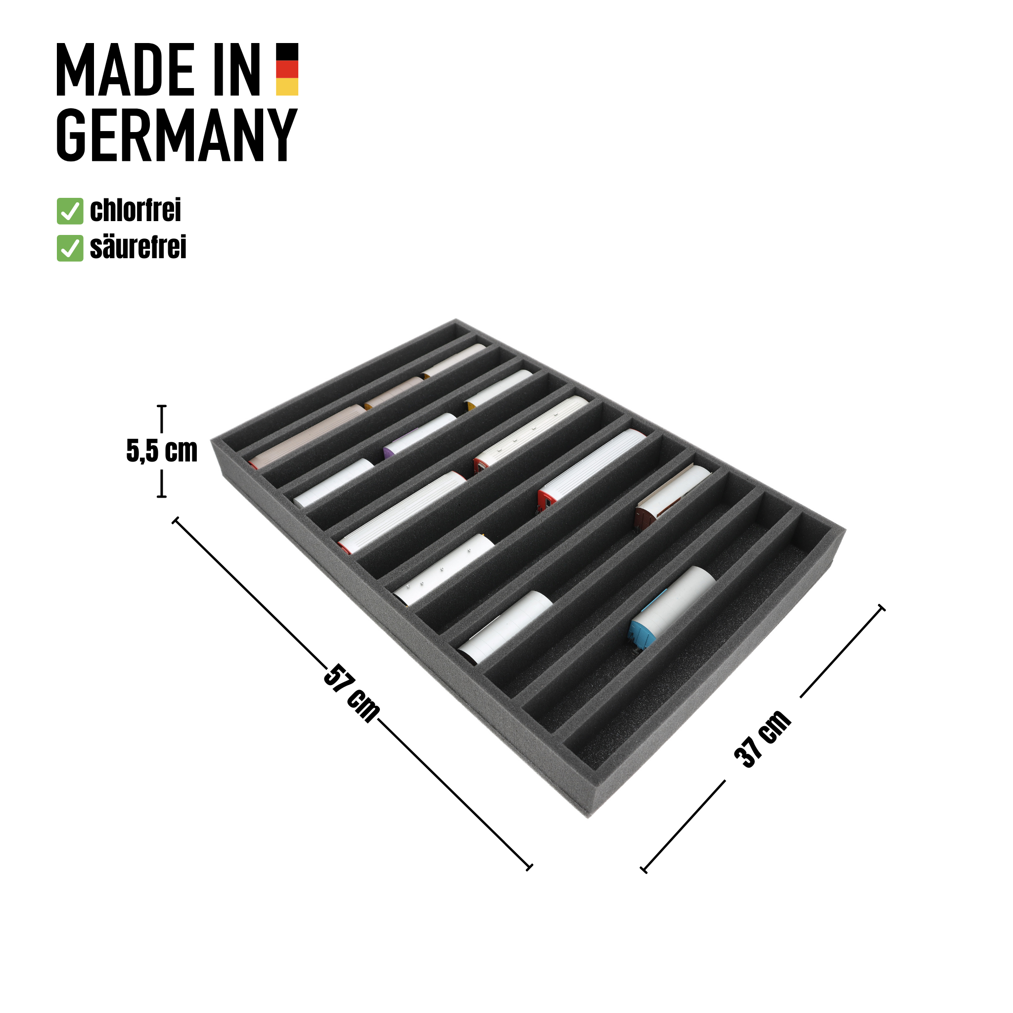 The foam insert has the dimensions: 570 mm x 370 mm x 55 mm total height (45 mm usable height + 10 mm foam base).