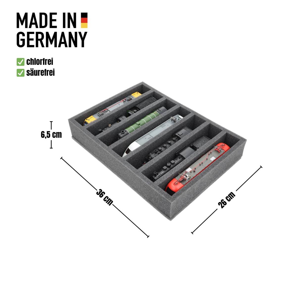 Sicherer Schutz für deine Spur 00 Modelle: Die Feldherr Schaumstoffeinlage mit 7 Fächern bewahrt Loks und Waggons stehend und griffbereit auf - ideal für Transport oder Lagerung in 40 x 30 cm Euroboxen