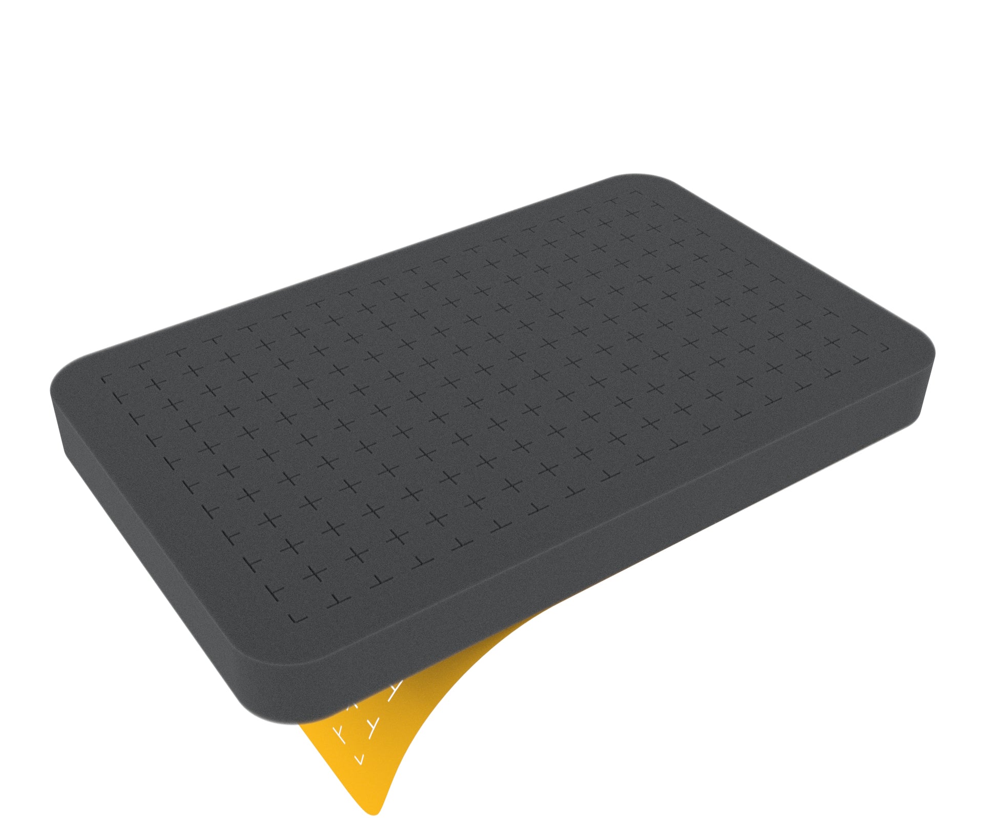 Dieses 25 mm hohe Half-Size Insert verfügt über ein vorgeschnittenes Raster von 14 mm x 14 mm. Es eignet sich hervorragend für enpfindliche Transportgüter wie kleinere Tabletop-Miniaturen, Klingen und Werkzeug.
