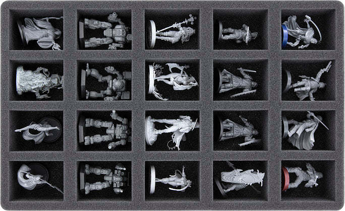 Die Einlagen bieten dir Platz für bis zu 60 Miniaturen auf Bases bis 35 mm Durchmesser. Die vorgeschnittenen Fächer eignen sich z. B. hervorragend für Modelle im 28 mm Maßstab von GW und anderen Miniaturenspielsystemen.