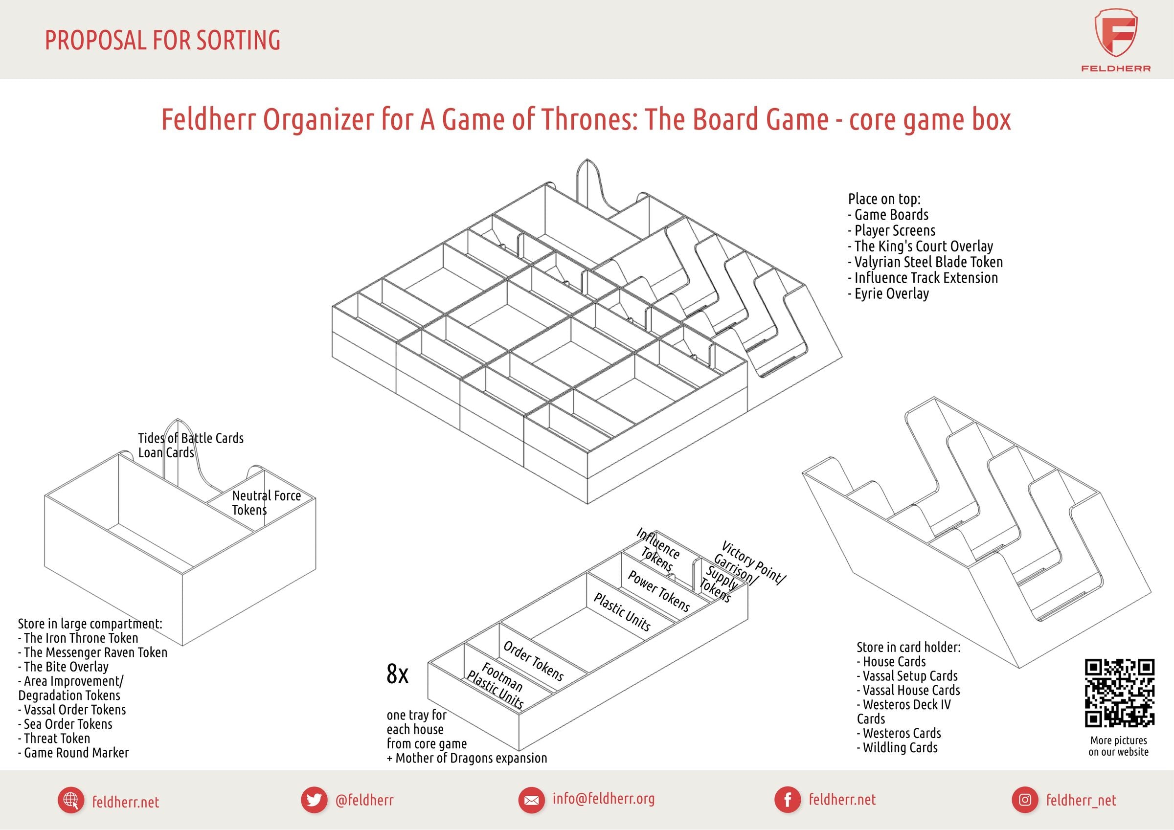- Das gesamte Spielmaterial des “Der Eiserne Thron: Das Brettspiel Zweite Edition“-Grundspiels findet in den Token- und Kartenhaltern des Organizer-Sets Platz.