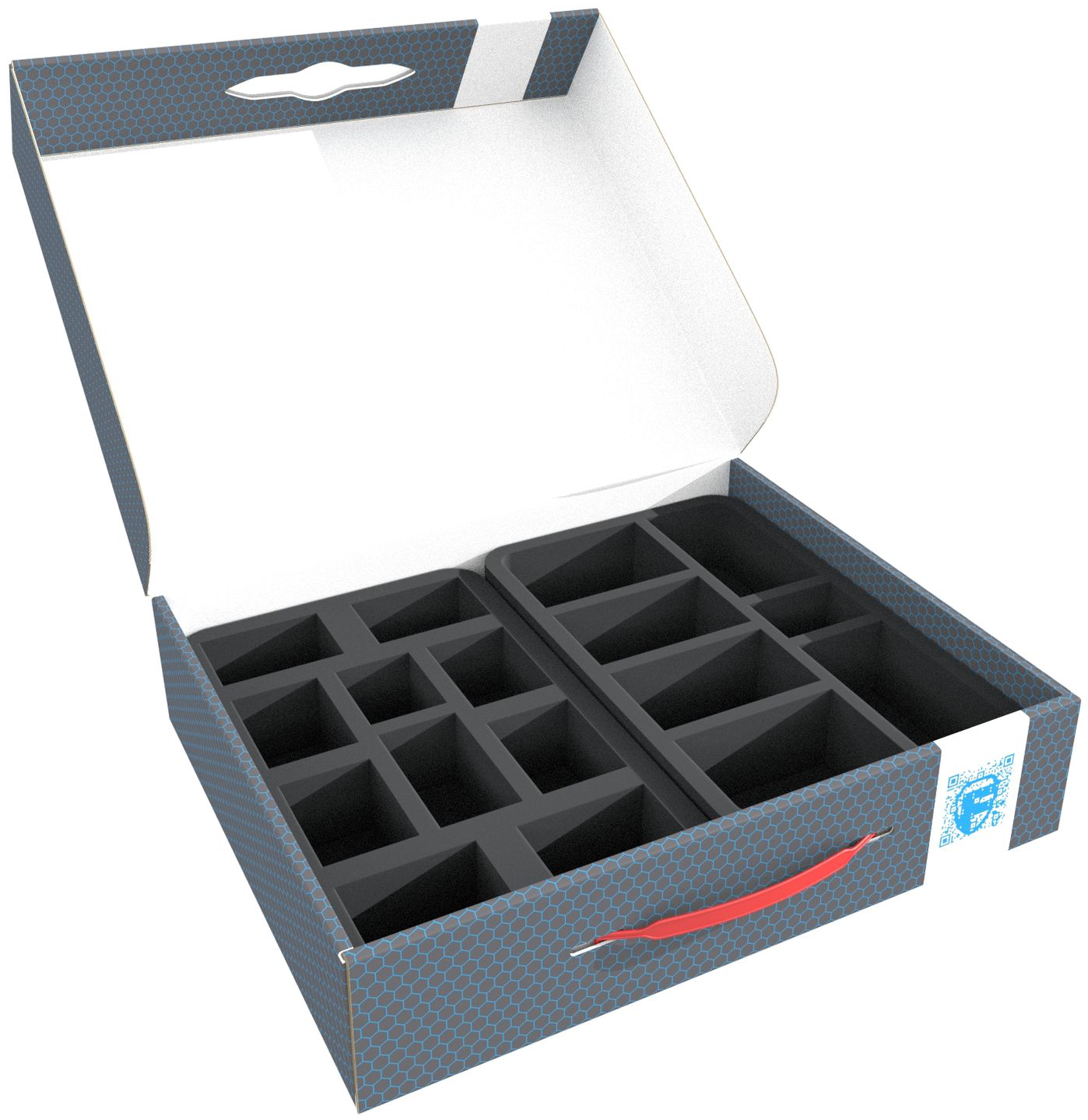 Die Lagerbox FSLB075 besteht aus beschichtetem, einwelligem Karton. Dadurch ist sie nicht nur angenehm leicht, sondern auch besonders reißfest und stabil. So kannst du Miniaturen sicher und staubgeschützt aufbewahren, mit dem praktischen Tragegriff aus Kunststoff auch mühelos transportieren.