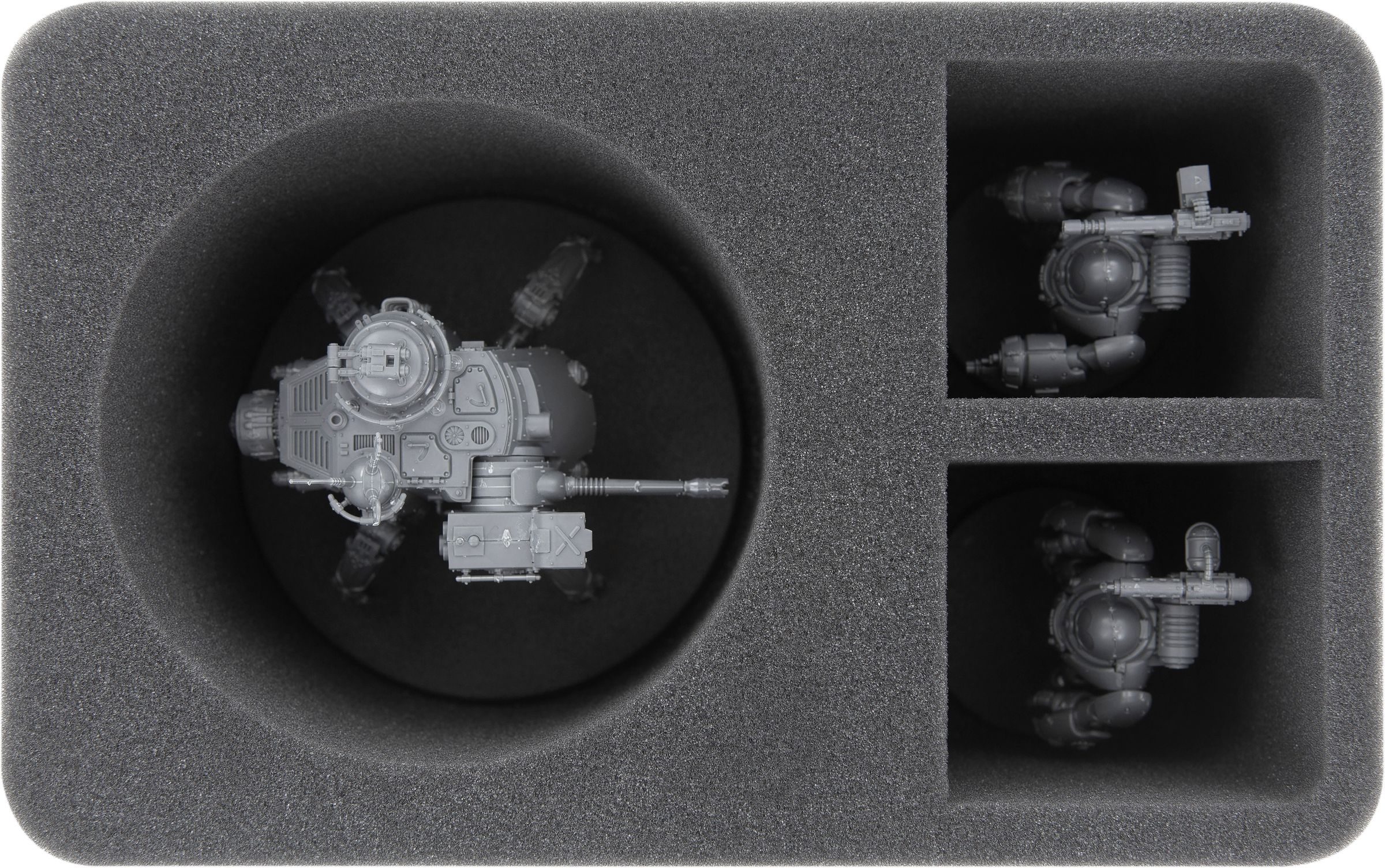 Die Half-Size-Schaumstoffeinlage mit 3 Fächern besitzt ein großes Fach, das exakt auf den Skorpius Dunerider oder den Disintegrator zugeschnitten wurde. Die beiden rechteckigen Fächer eignen sich hervorragend zum Verstauen weiterer Miniaturen deiner AdMech-Armee oder für optionale Bauteile.