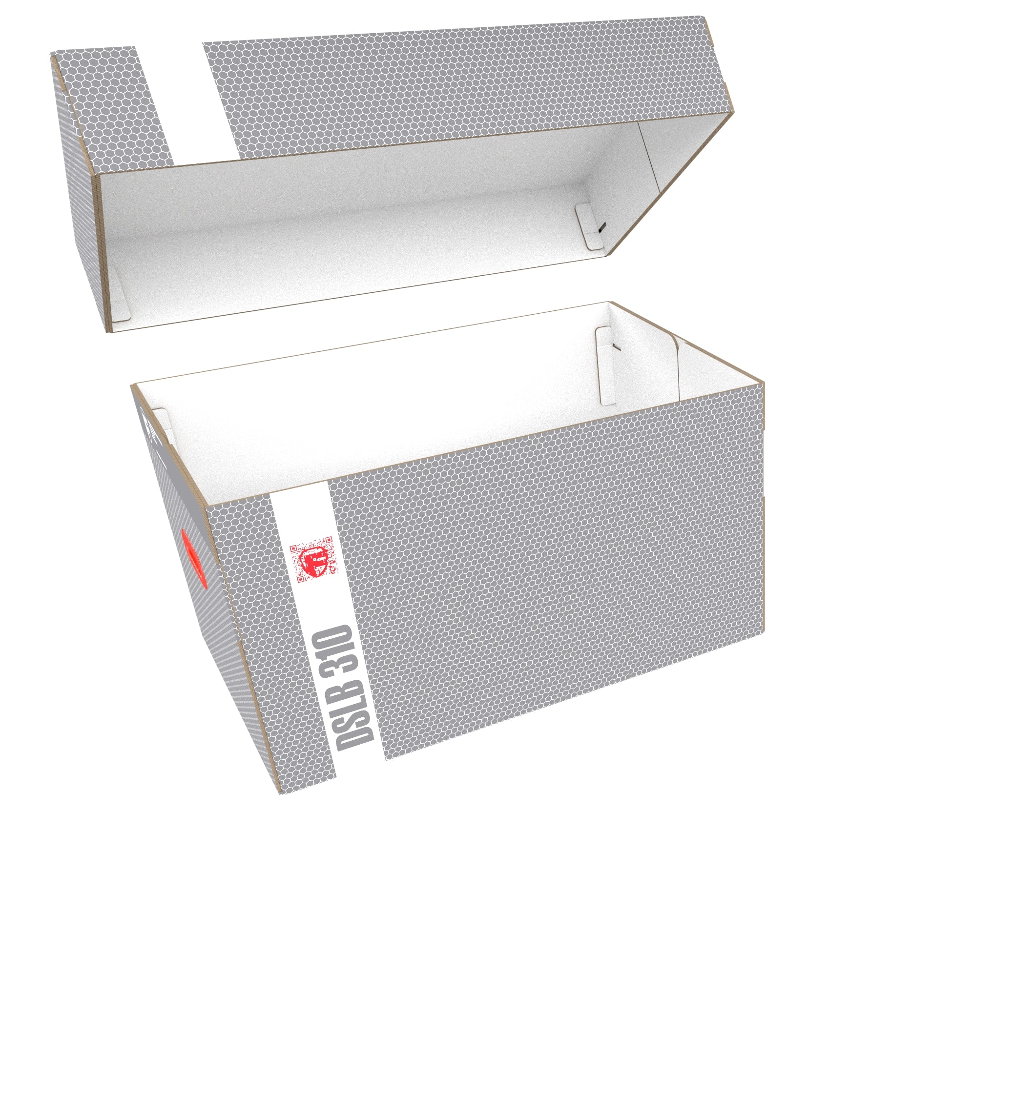 Die Lagerbox DSLB310 besteht aus beschichtetem, doppelwelligem Karton und ist damit einerseits sehr leicht und dabei trotzdem stabil. Der aufsetzbare Deckel schützt den Inhalt zuverlässig vor Staub und anderen äußeren Einflüssen. Mit den beiden kunststoffverstärkten Tragegriffen an den Seiten lässt sich die Box bequem transportieren.