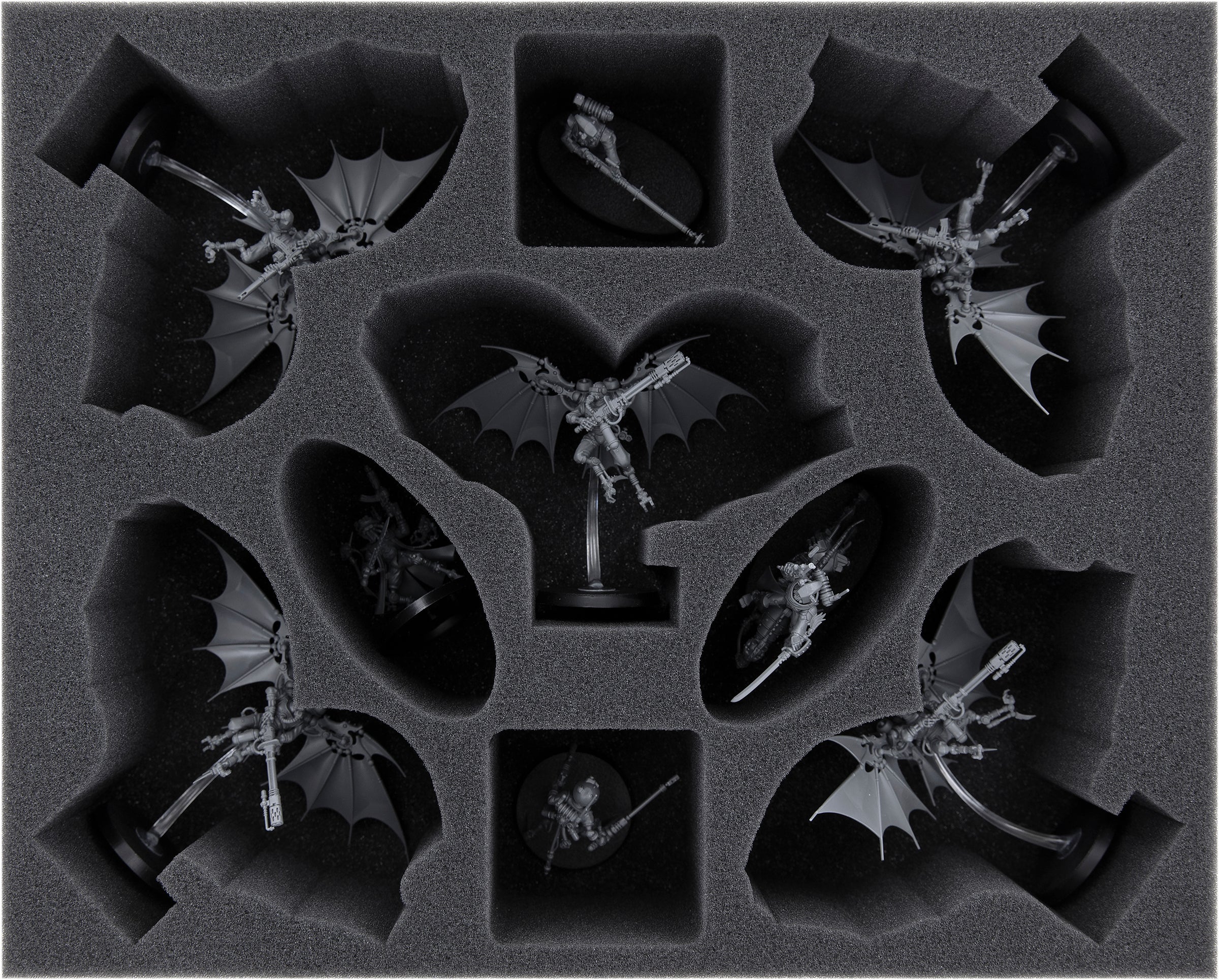 Damit sich deine Pteraxii-Einheiten auch nach dem Transport zum Spieltisch noch in die Lüfte erheben können bietet das Full-Size Insert bietet 5 miniaturengenau geschnittene Fächer. Es eignet sich für beide Bauvarianten inkl. Flugbases – die Pteraxii Skystalkers und die Pteraxii Sterylizors.