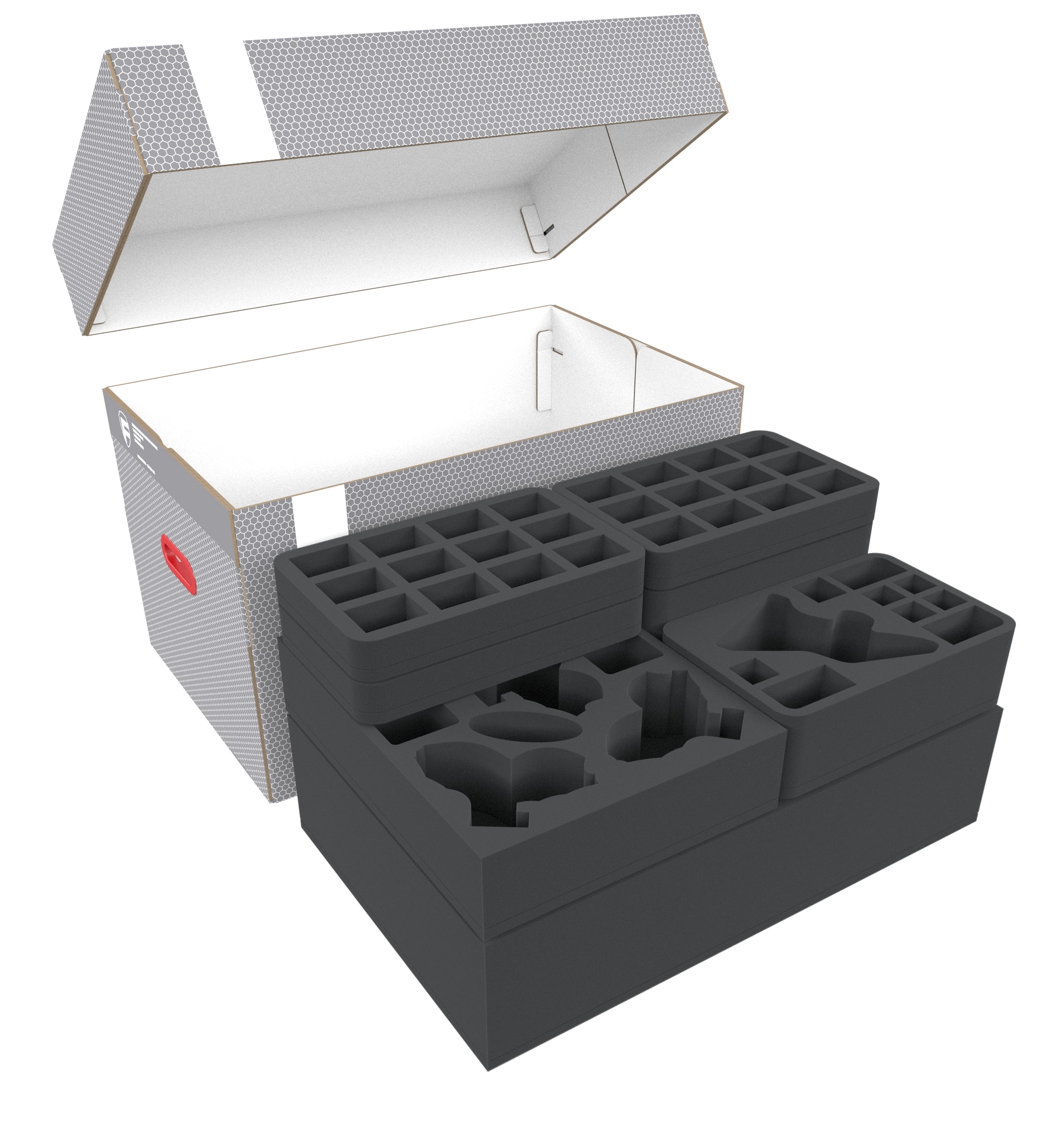 2 Schaumstoffmatten dienen als Höhenausgleich. Der mitgelieferte Schaumstoffdeckel schließt die Sache ab und stellt sicher, dass deine Miniaturen rundum gut geschützt sind.