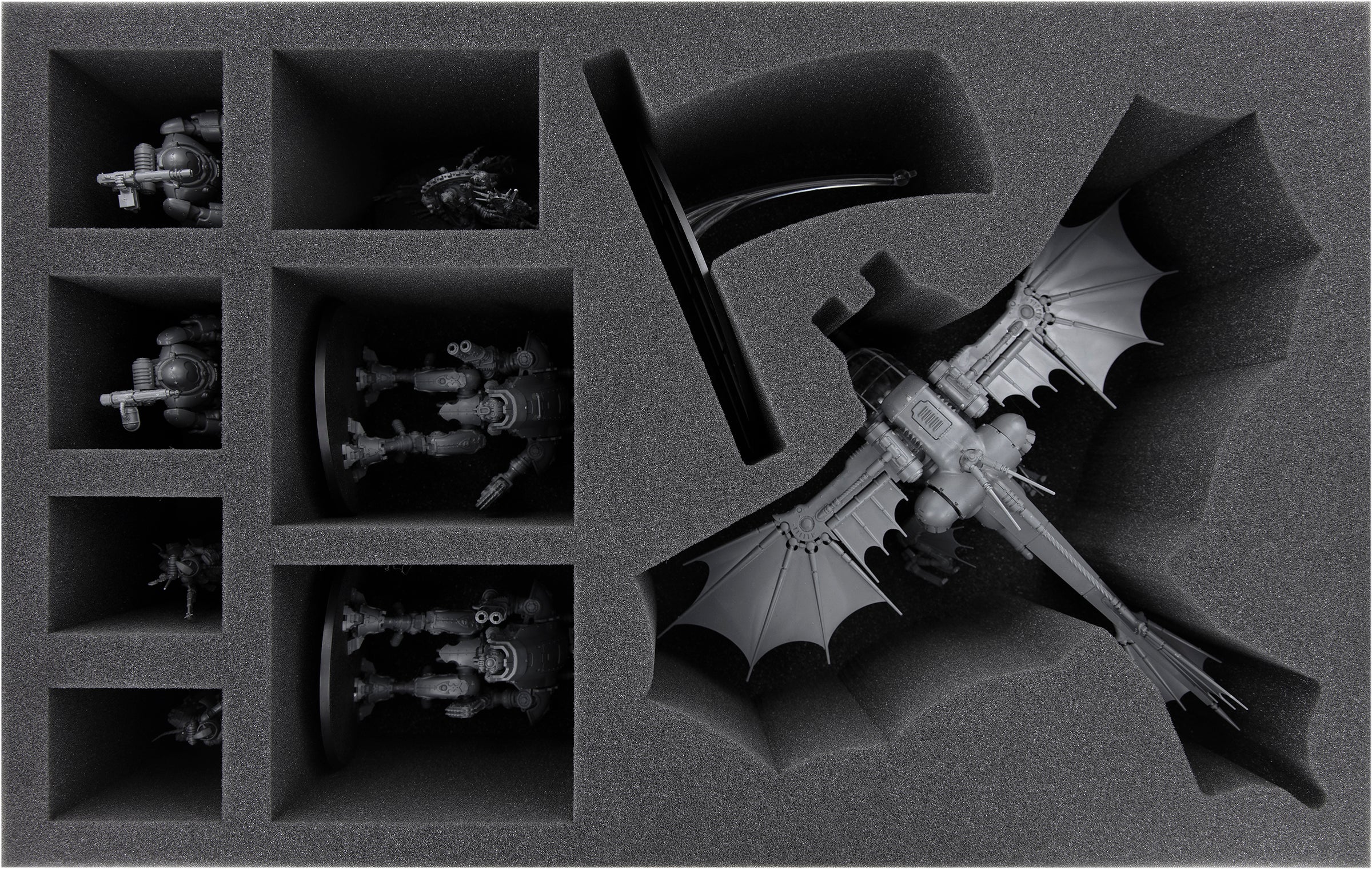 - 1 Full-Size Schaumstoffeinlage mit 5 miniaturengenau geschnittenen Fächern für Pteraxii Skystalkers und die Pteraxii Sterylizors + 4 weitere Fächer für Serberys Raiders, Sulphurhounds und Modelle mit ähnlichen Abmessungen (FSMEXU075BO)