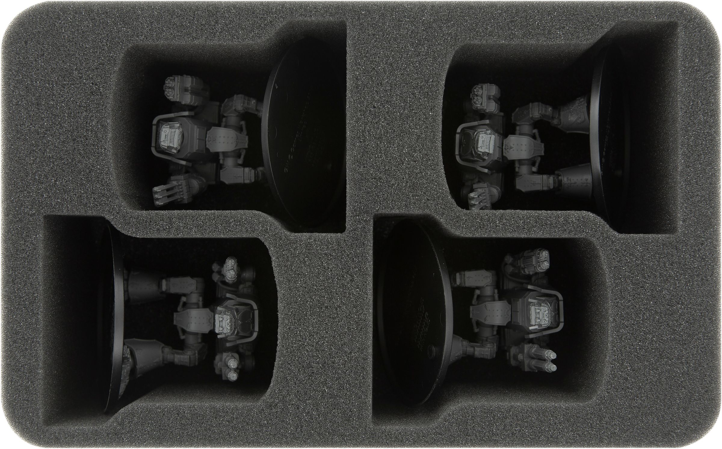 Sie besitzt vier maßgeschneiderte Fächer, in denen du 4 Warhound Scout Reaver Titan Modelle liegend unterbringen kannst.