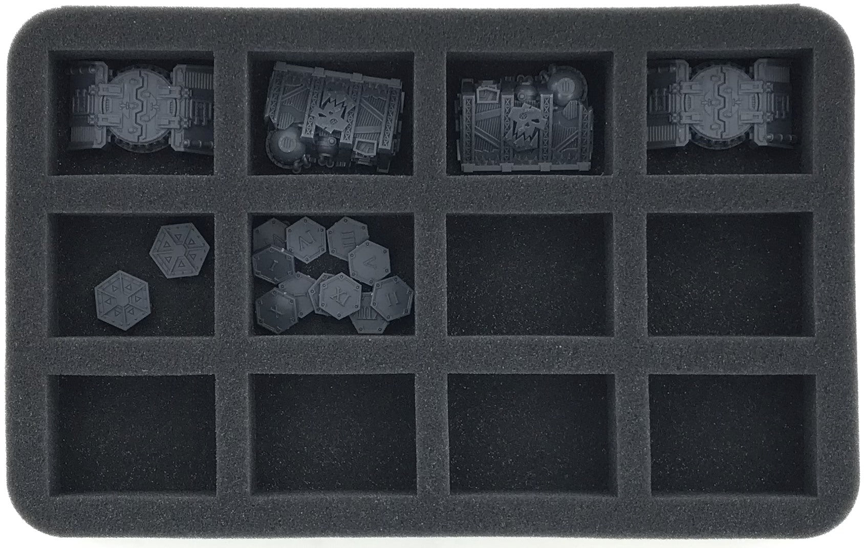 Für deine Bases steht dir die Schaumstoffeinlage mit elf Fächern zur Verfügung. Acht sechseckige Fächer eignen sich besonders gut zum ordentlichen Aufbewahren deiner Bases. Drei kleine Fächer in der Mitte können für Token und anderes Zubehör verwendet werden.