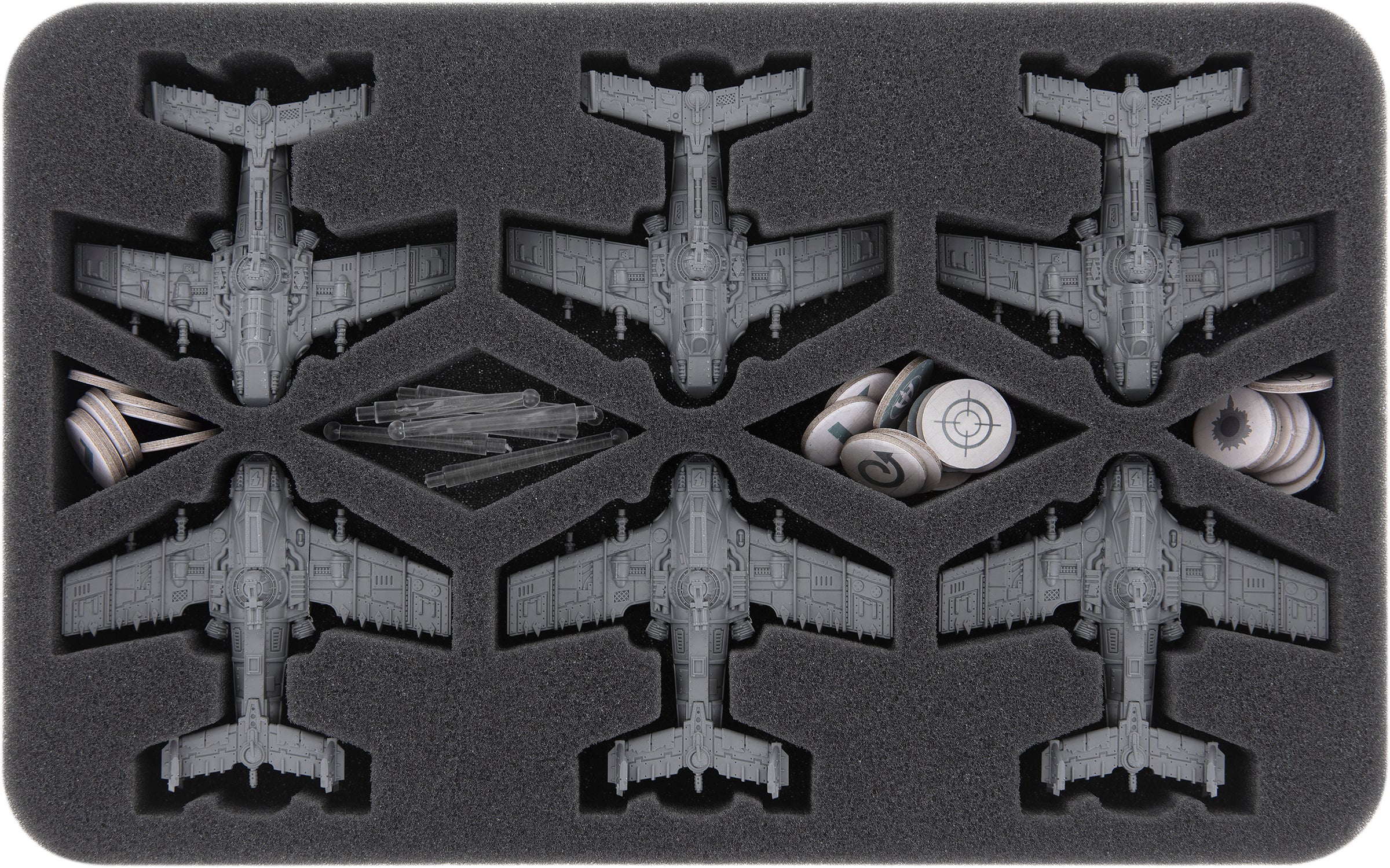 Sechs Half-Size Schaumstoffeinlagen sorgen dafür, dass alle Miniaturen deines Ork Luftwaaaghs ordentlich untergebracht sind. Maßgenaue Fächer für jedes einzelne Modell verhindern, dass die Figuren beim Transport umherrutschen oder aneinanderstoßen. Dadurch wird sichergestellt, dass die Bomben, Raketänz und Wummen auch beim Transport sicher am Flieger verbleiben. Zudem werden die Farben deiner bemalten Flieger vor Abrieb und Kratzern geschützt.