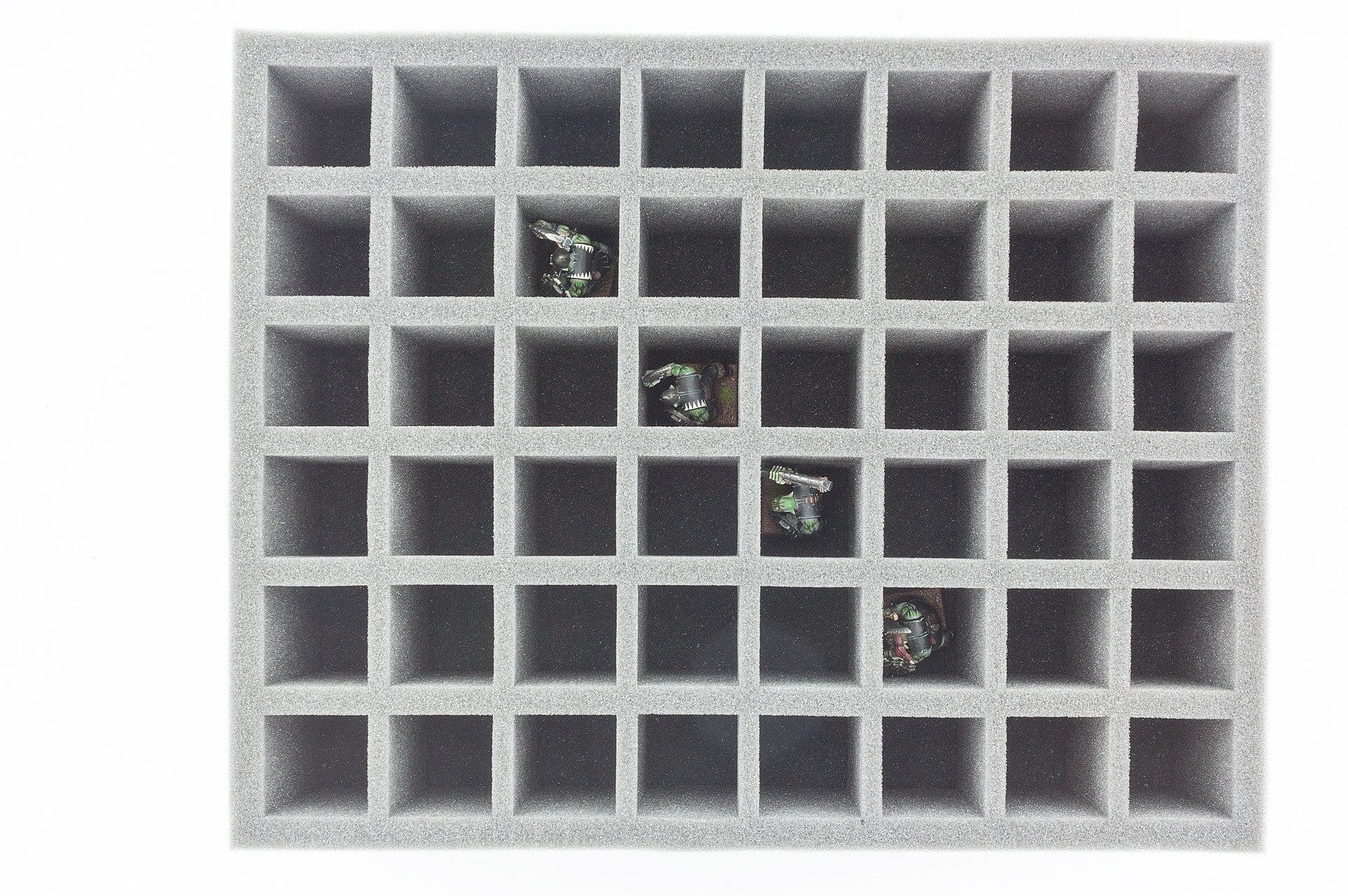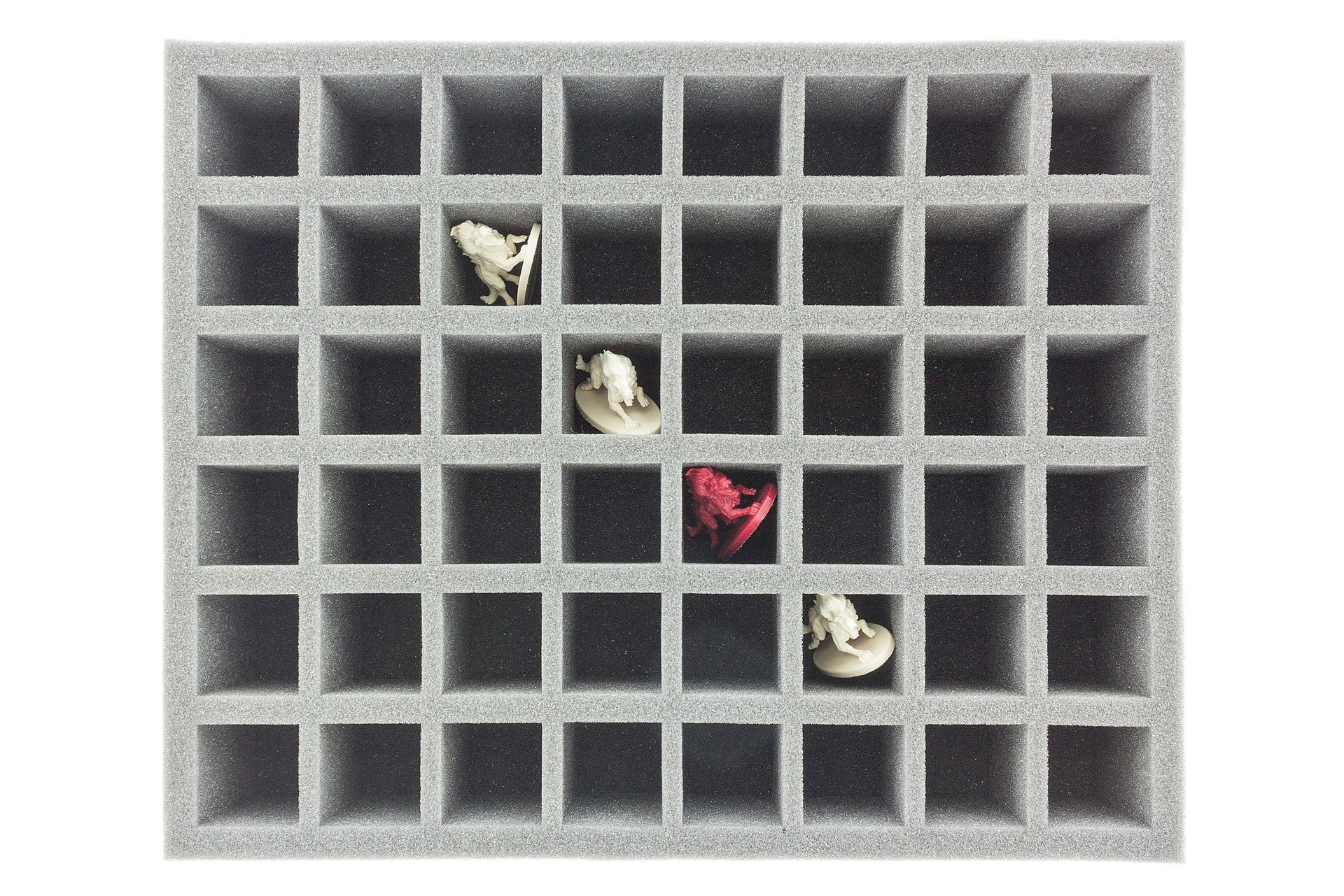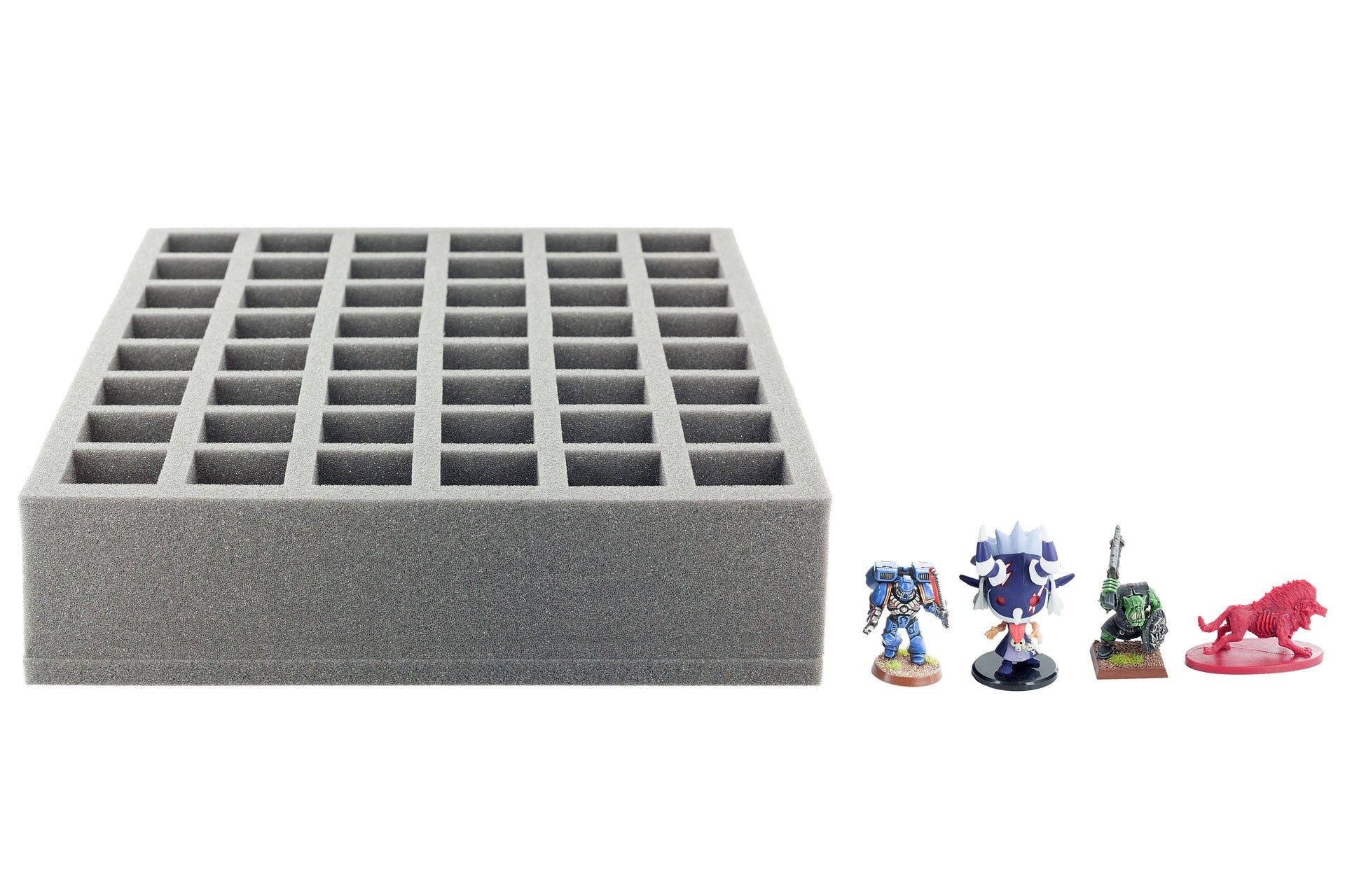 Die 70 mm Schaumstoffeinlage mit 48 Fächern (34 mm x 34 mm x 60mm) für größere / höhere Tabletop Miniaturen und anderen Figuren auf 25 bis 30 mm Base. Sehr gut zum Transport und Schutz von Modellen mit langen Speeren, Hellebarden, Schwertern oder Musketen.
