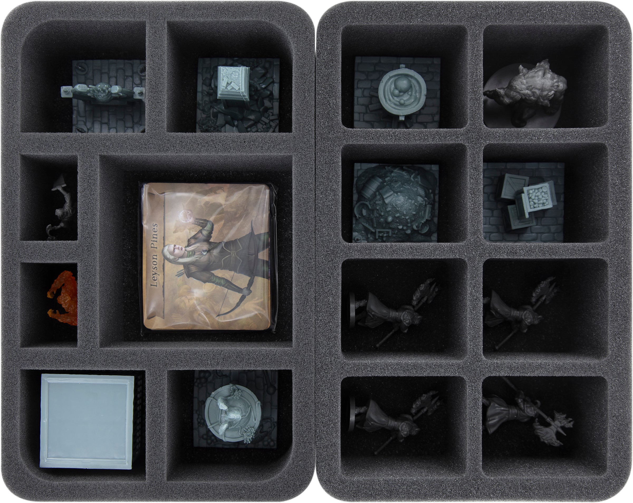 Heldenmodelle und ähnlich große Miniaturen, die du noch nicht einsortiert hast, finden in den beiden identischen Half-Size Einlagen ihren Aufbewahrungsort. Hier platzierst du auch deine Karten. Insgesamt 6 Kartenfächer warten auf den beiden Inserts.