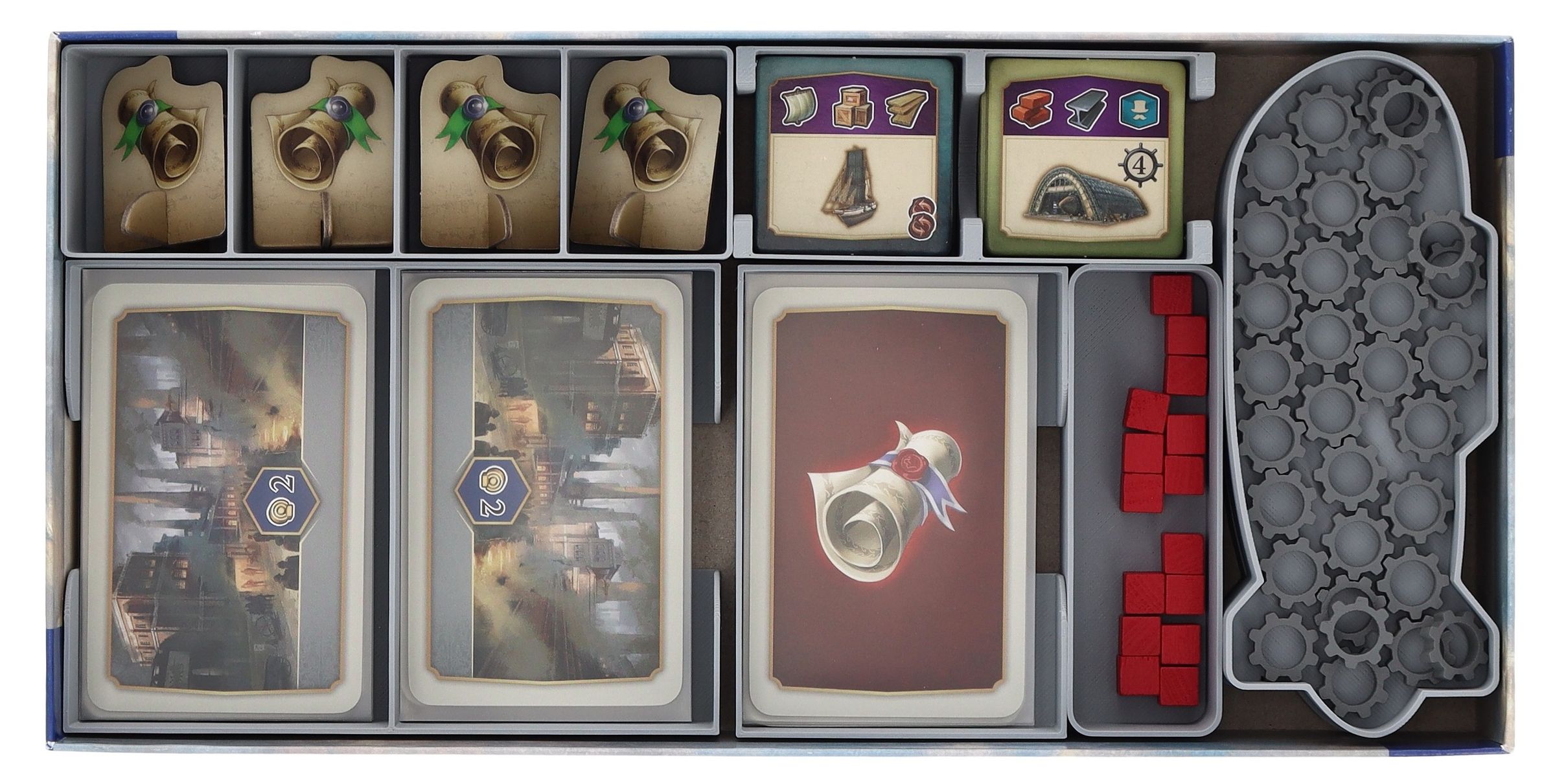 Damit die Zahnräder auch weiterhin ineinandergreifen und Effizienz nicht nur die Wirtschaft, sondern auch deinen Spieltisch beflügelt, gibt es nun auch das Feldherr Organizer Insert für die Box der Erweiterung.