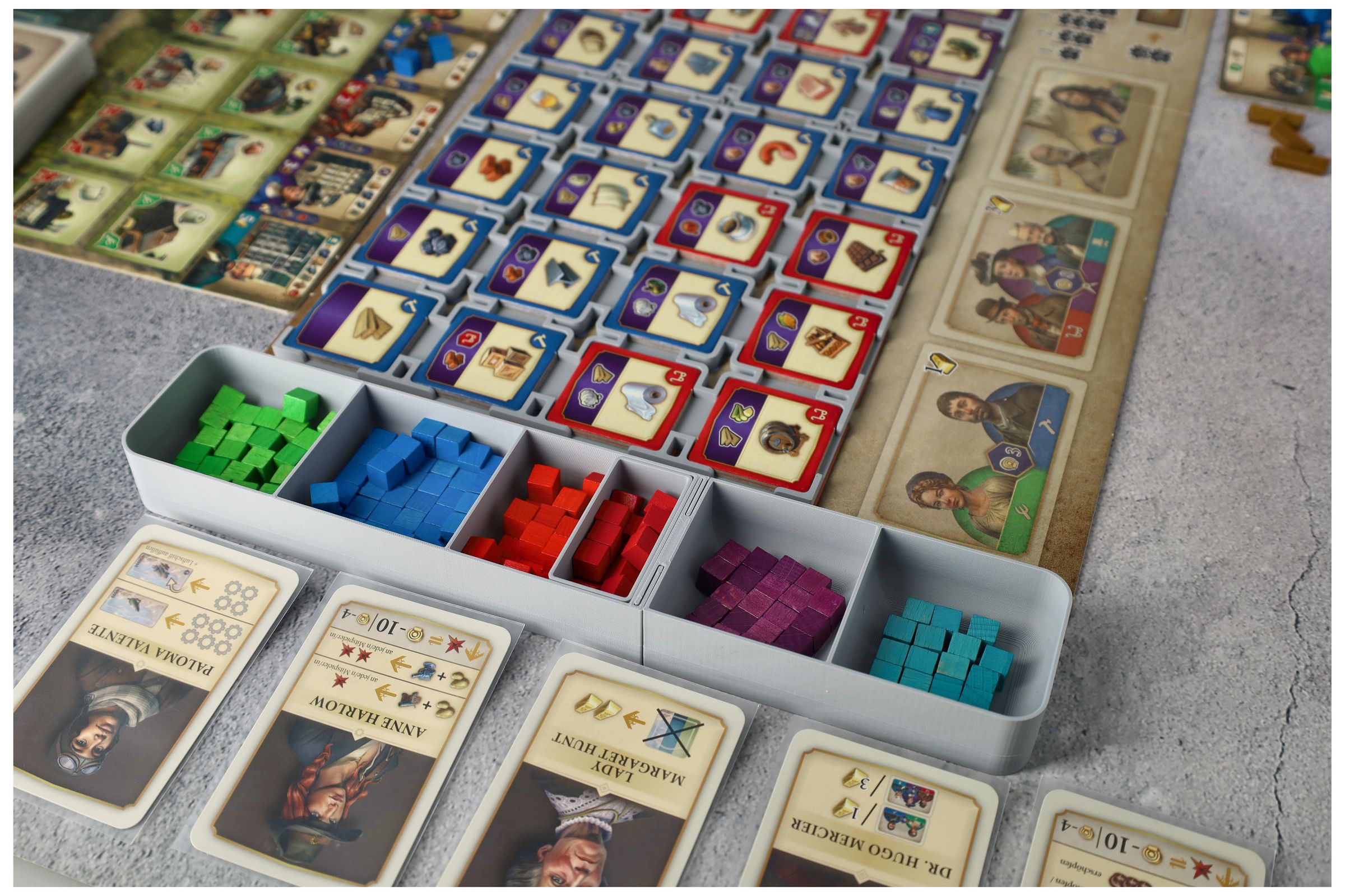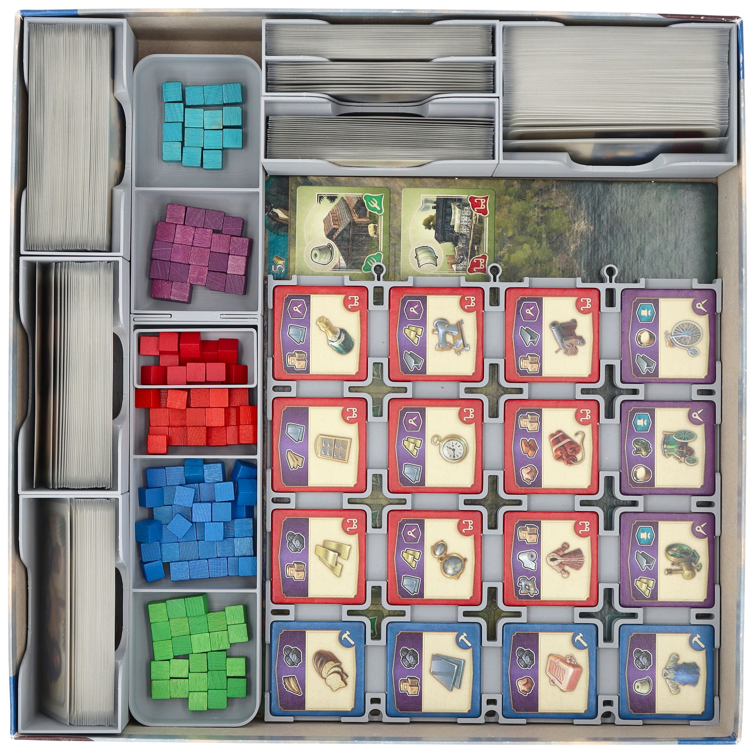 - Die Bevölkerungssteine werden nach Farbe sortiert und können bequem vorsortiert am Spielbrett platziert werden.