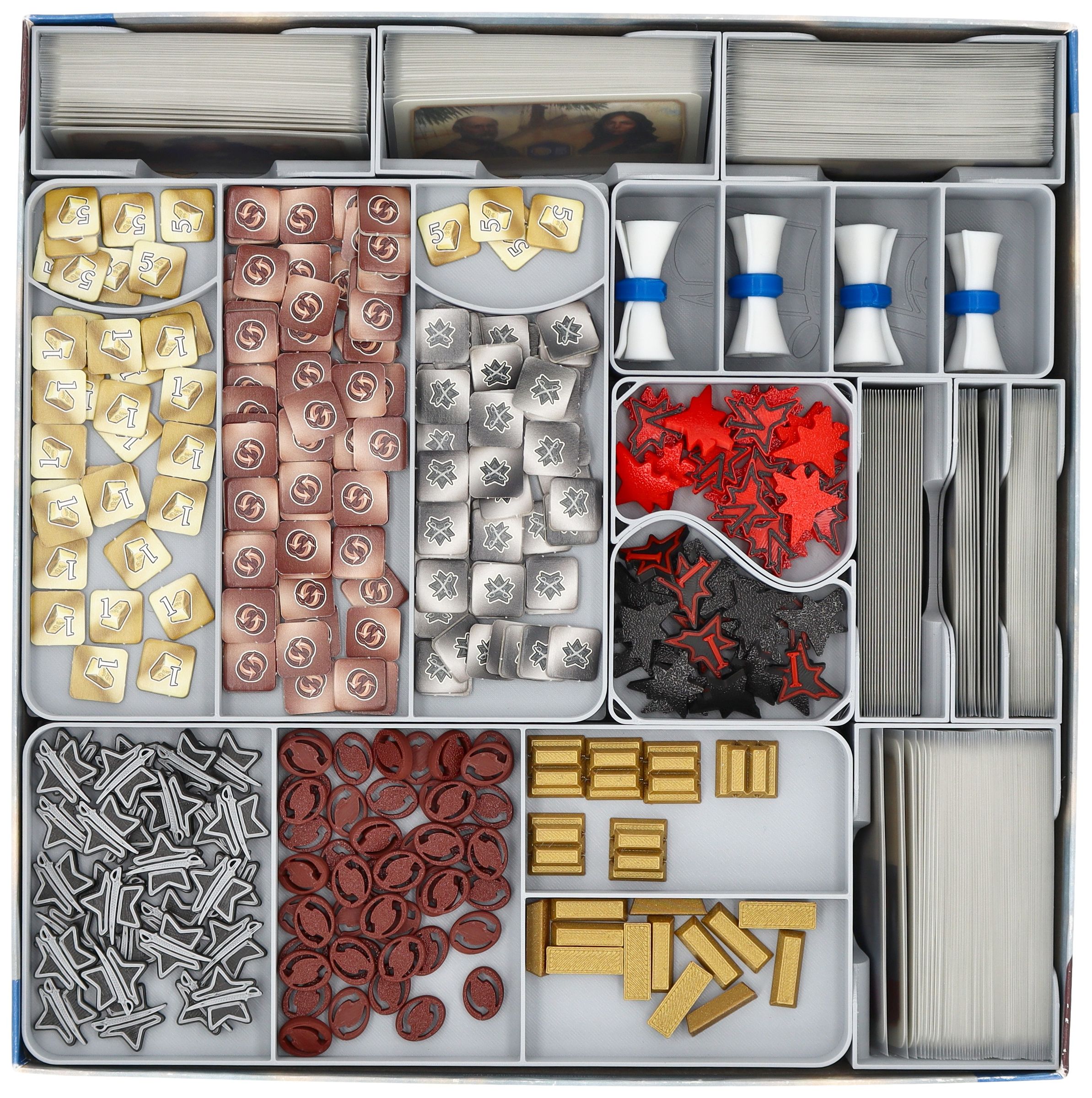 - Das Insert bietet 2 extra Trays zum Sortieren der 3D-Token. Du kannst also die originalen Token aus Pappe weiterhin im Karton aufbewahren.