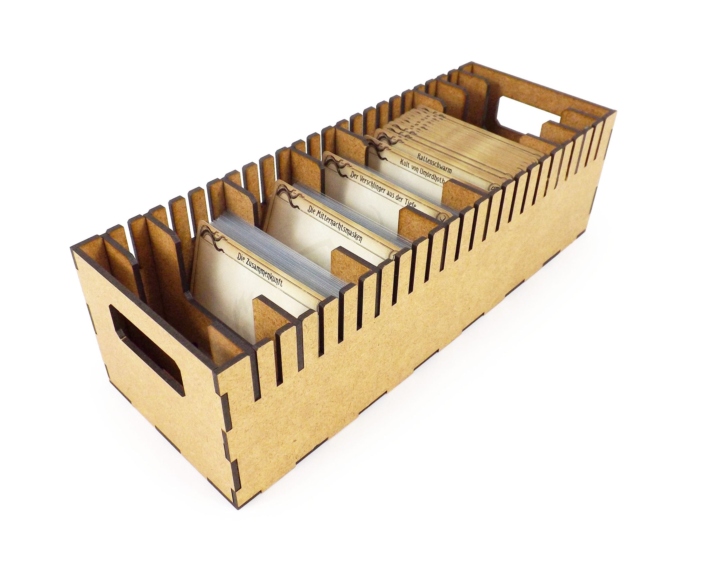 Der maßgeschneiderte Einsatz enthält 8 frei versetzbare Trennwände, und Kartenhüllen werden natürlich unterstützt. Es passen ca. 390 Karten mit Schutzhüllen und ca. 780 ohne Hüllen in die Box. Sichere Dir jetzt den passenden Einsatz für Deine "Arkham Horror"-Kartensammlung!