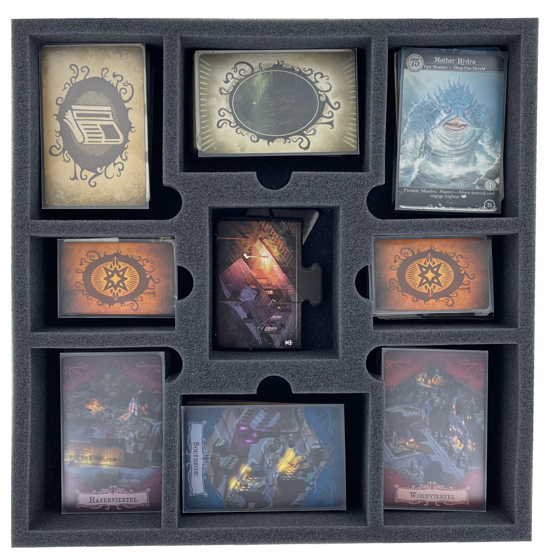 Die beiden Einlagen verfügen über jeweils 5 Fächer, in denen du Karten übersichtlich verstauen kannst. Noch mehr Karten bekommst du in der zusätzlichen Einlage einsortiert. So bringst du die großen Karten wie Ereignis- und Anomaliekarten und die kleinen Karten wie Monster- und Zustandskarten übersichtlich sortiert unter. Selbstverständlich passen alle Karten mit Schutzhüllen in die Fächer hinein.