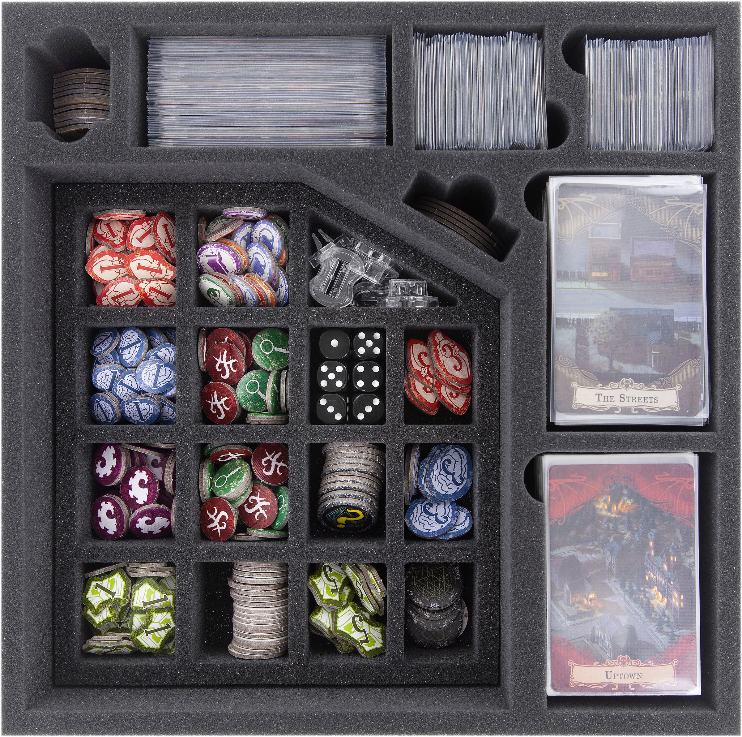 Damit ist alles ordentlich und sicher verstaut, so dass kein Geldmarker verloren geht. Karten und Marker sind schnell zur Hand und du sparst viel Zeit und Nerven beim Spielaufbau.