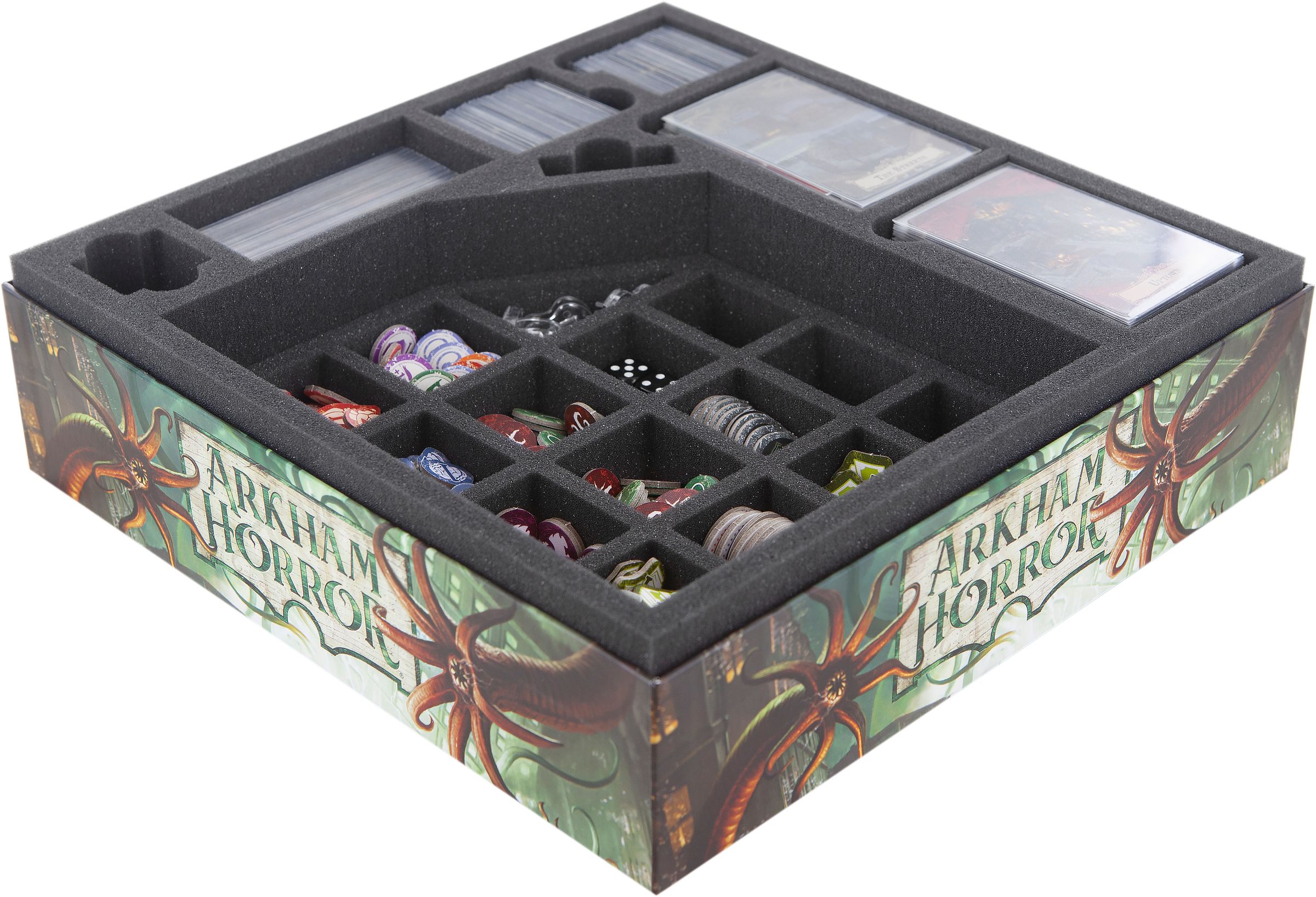 - Das Set passt genau in die originale Brettspielbox von „Arkham Horror 3. Edition“.