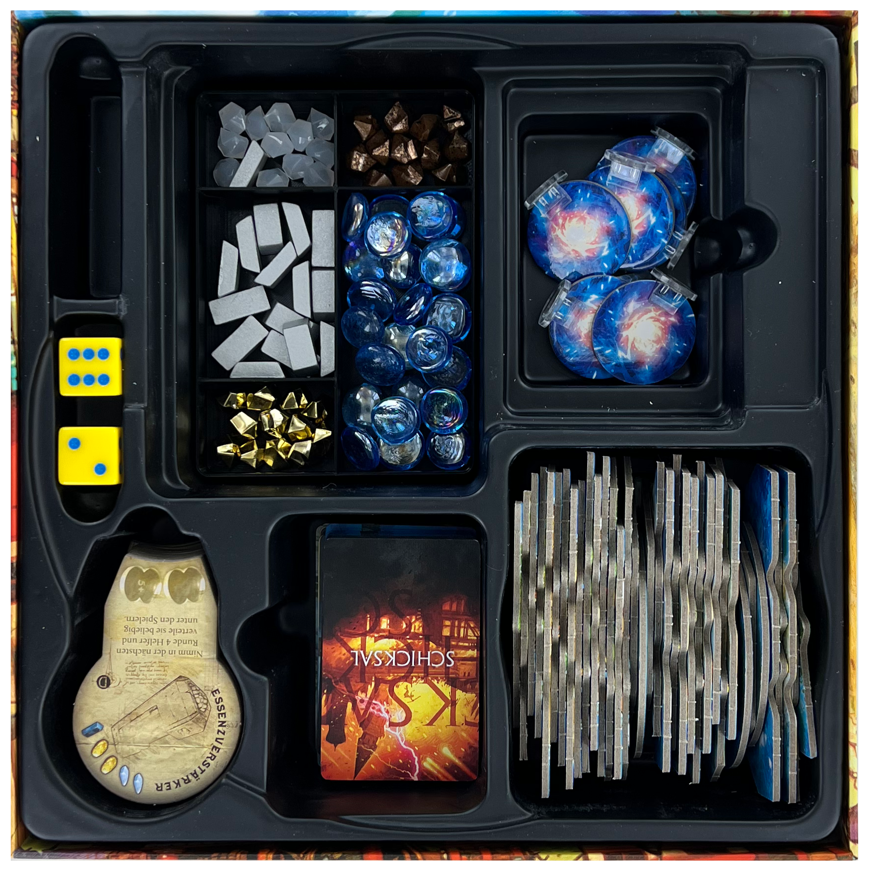 - 1 Tokenhalter aus Kunststoff mit 5 Fächern für Ressourcen wie Arkane Energie, Kristalle, Meteorerz, Gold und Atlantium.