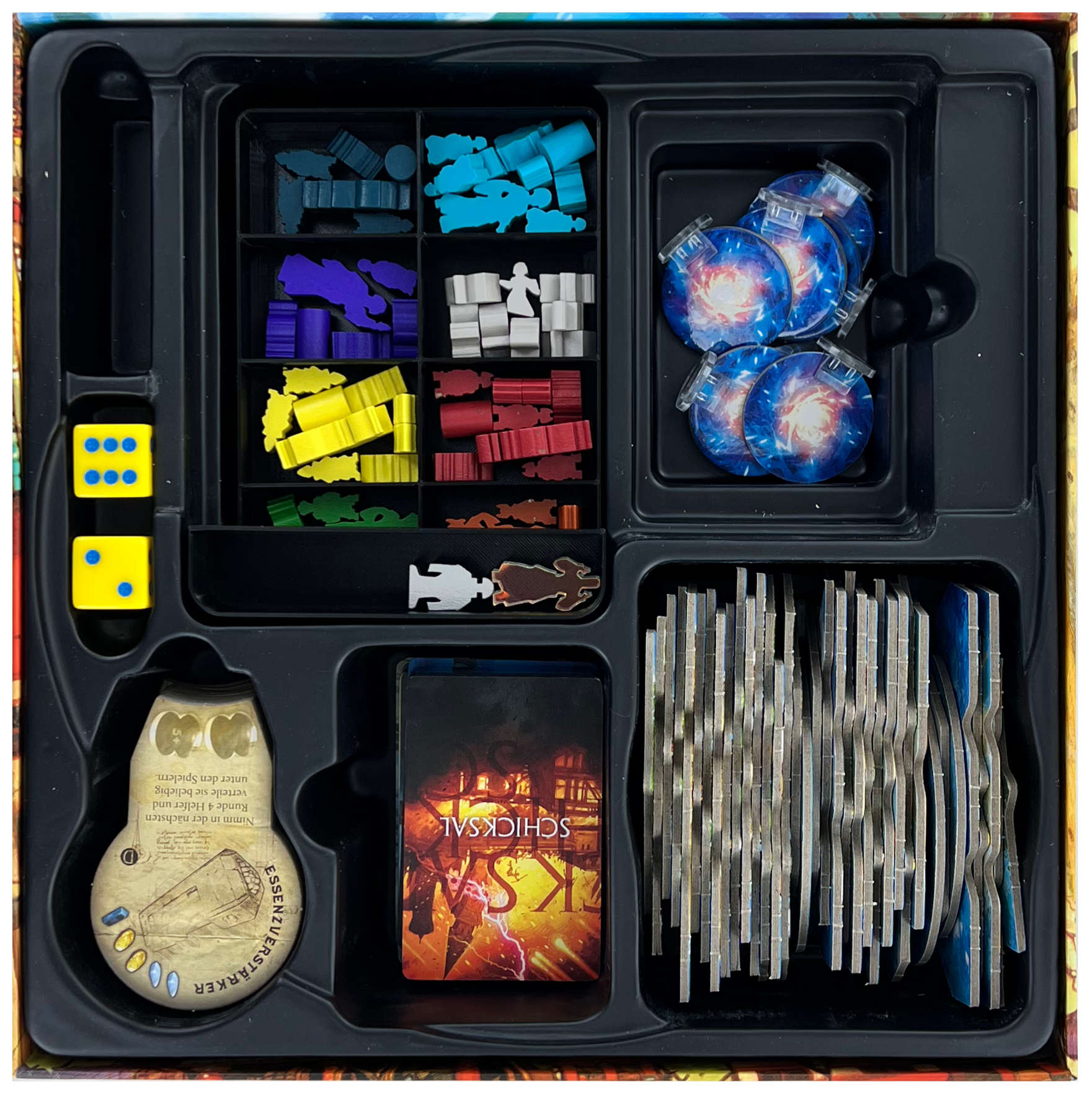 - Zur Aufbewahrung der Inserts im Spielkarton wird der originale Plastikeinsatz benötigt.