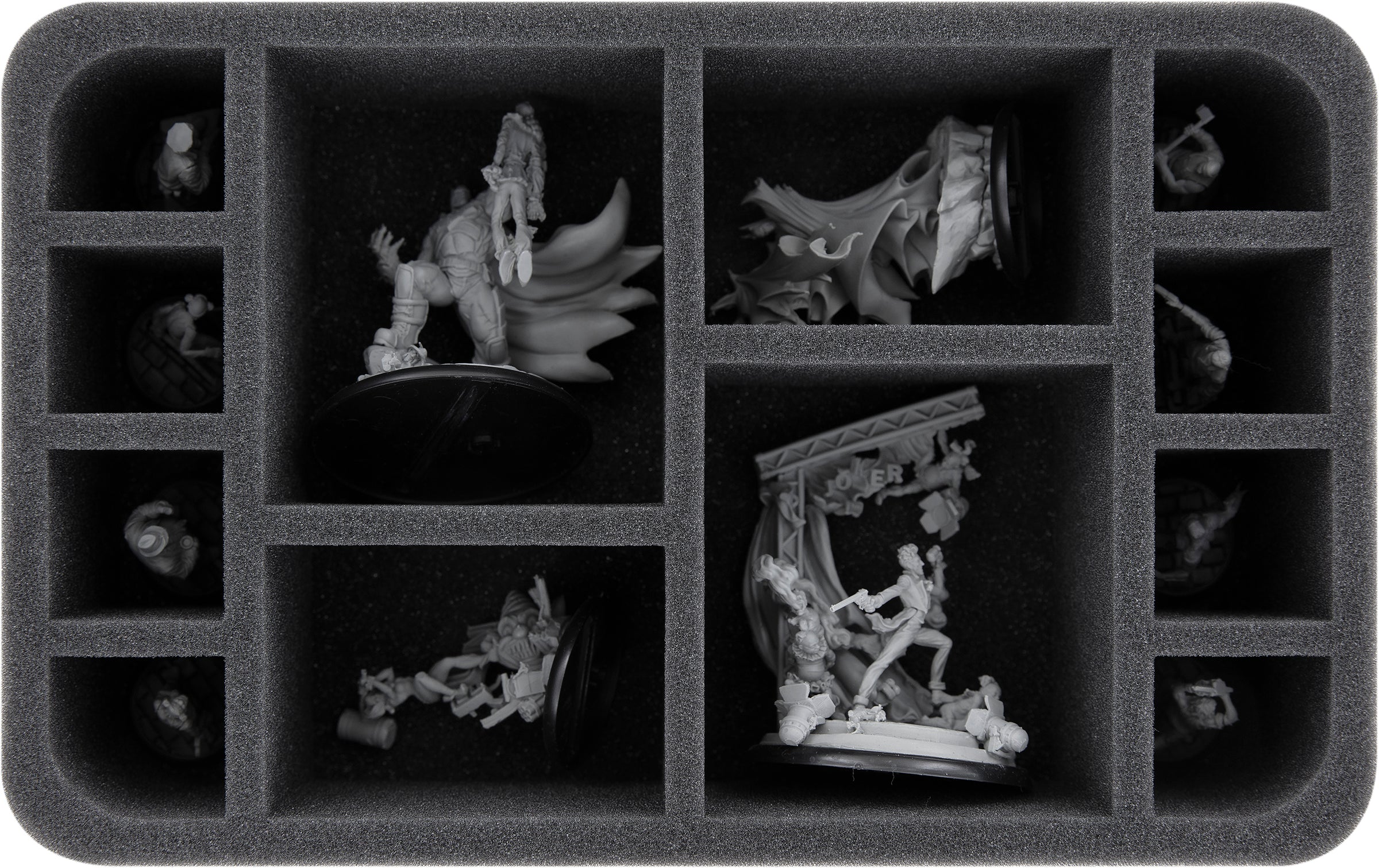 Die beiden großen Fächer sind ideal für Charakter-Figuren auf 60 mm Bases, wie der Joker oder Bane the Bat. Die mittleren Fächer bieten Platz für 40 mm Base-Miniaturen (z. B. Batman, Harley Quinn) oder für ausladende Modelle auf 30 mm Bases.