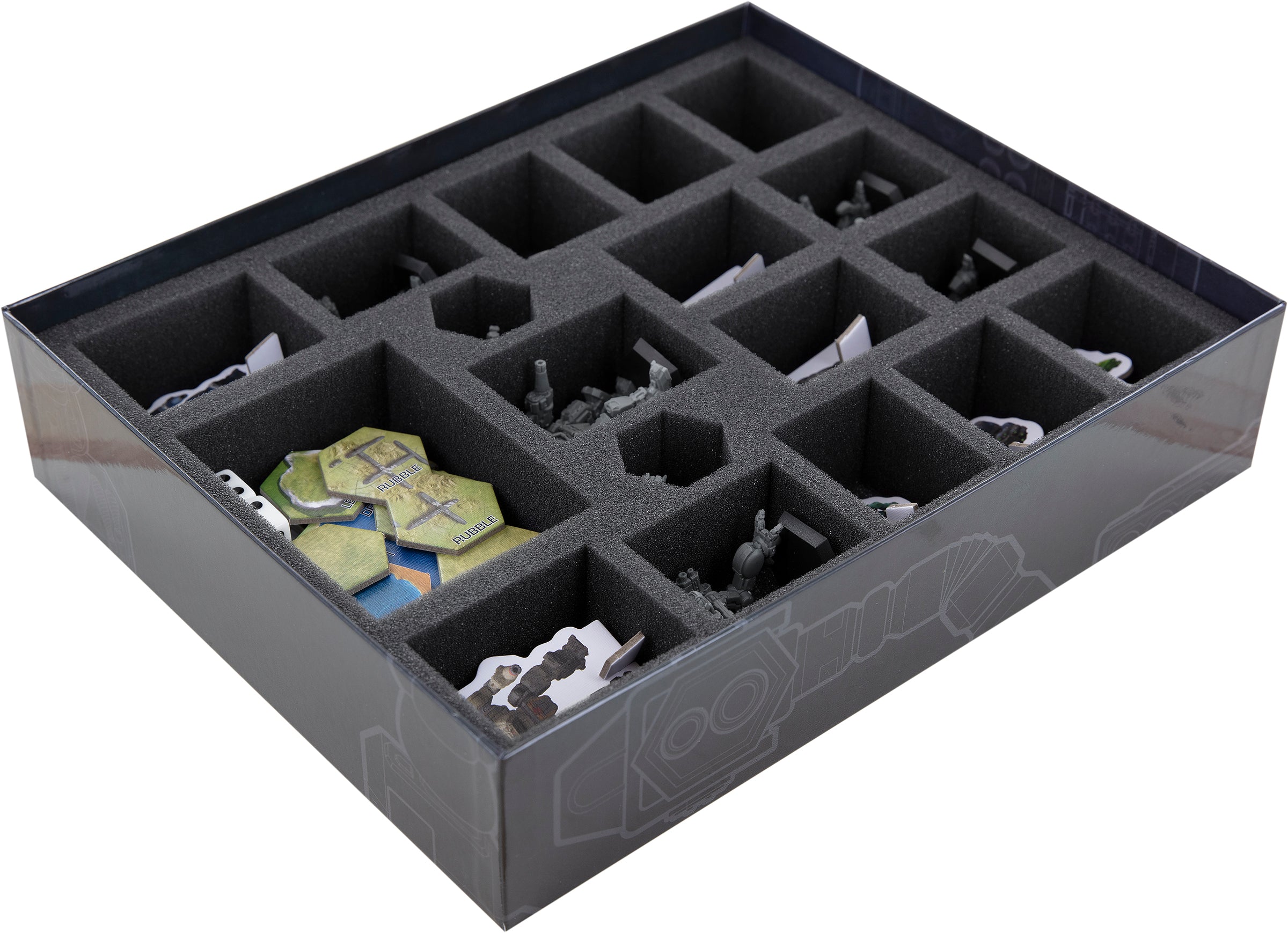 Sieben Fächer sind maßgeschneidert für die Plastik-Miniaturen der fünf OmniMechs (Executioner, Timber Wolf, Nova, Grendel und Adder) und die beiden Bases der Elementals.