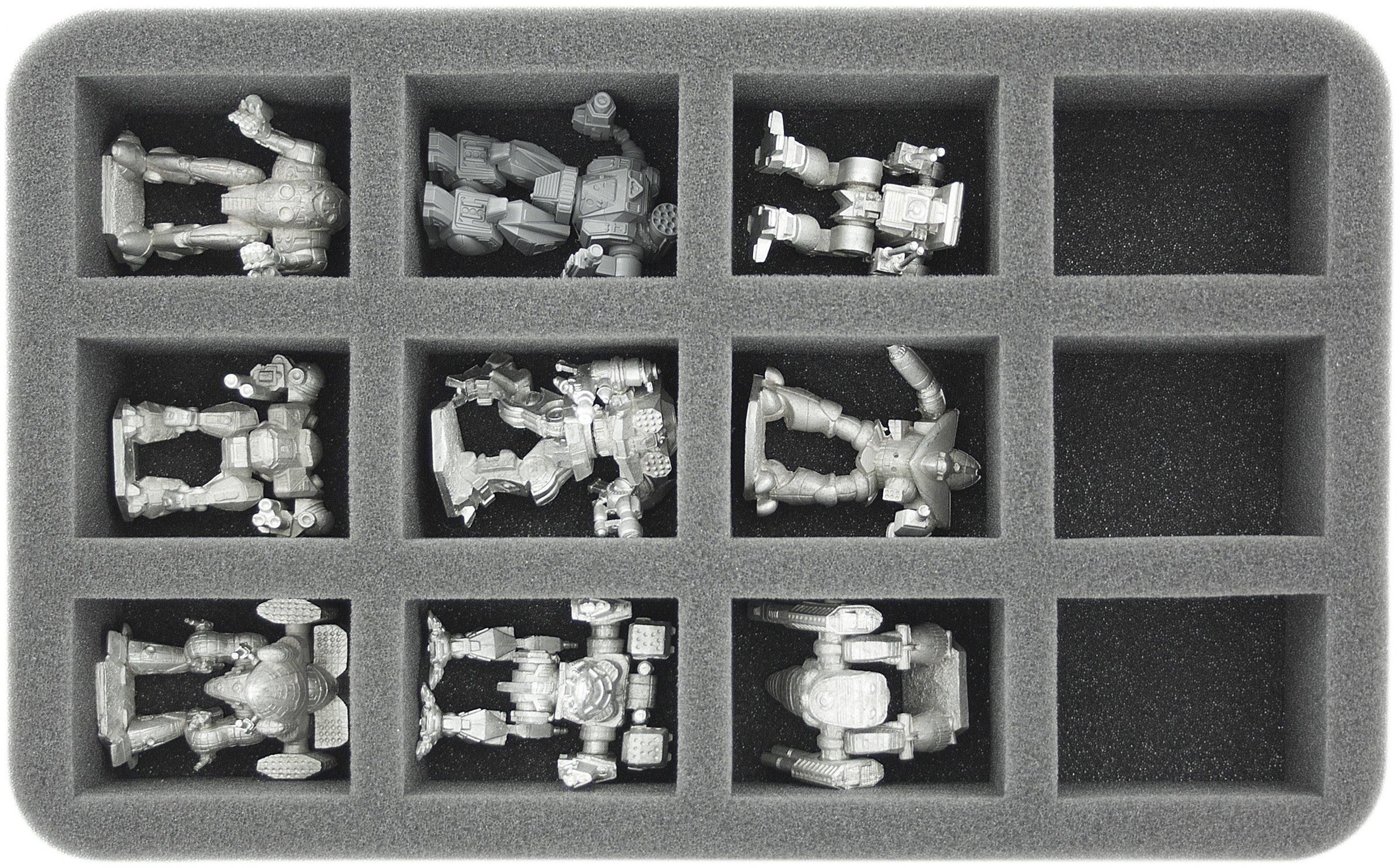Diese Schaumstoffeinlage eignet sich mit ihren 12 identischen Fächern hervorragend, eine ganze Kompanie, also 12 Mechs übersichtlich und bestens geschützt aufzubewahren.