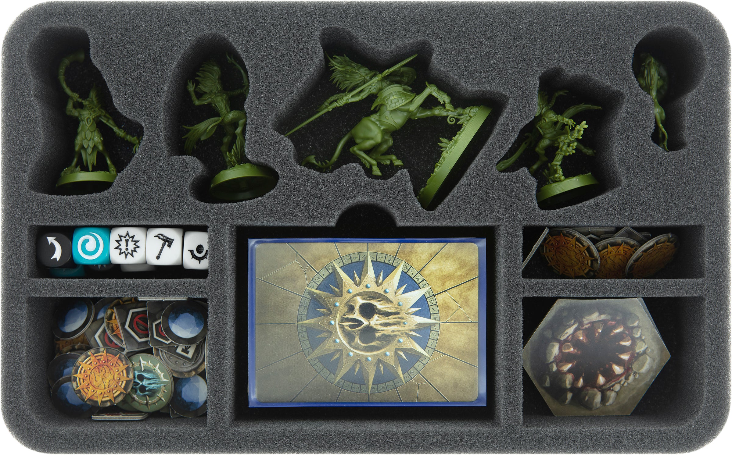 Unter den Figuren ist jeweils ein weiteres Fach für die Spielkarten reserviert. Es ist mit einer fingerbreiten Aussparung versehen, damit du die Karten leichter herausbekommst. Bis zu 40 Stück passen hier, selbstverständlich auch mit Sleeves, hinein. Deck-Boxen passen hier ebenfalls. Würfel und Marker können in die restlichen vier Fächer einsortiert werden.