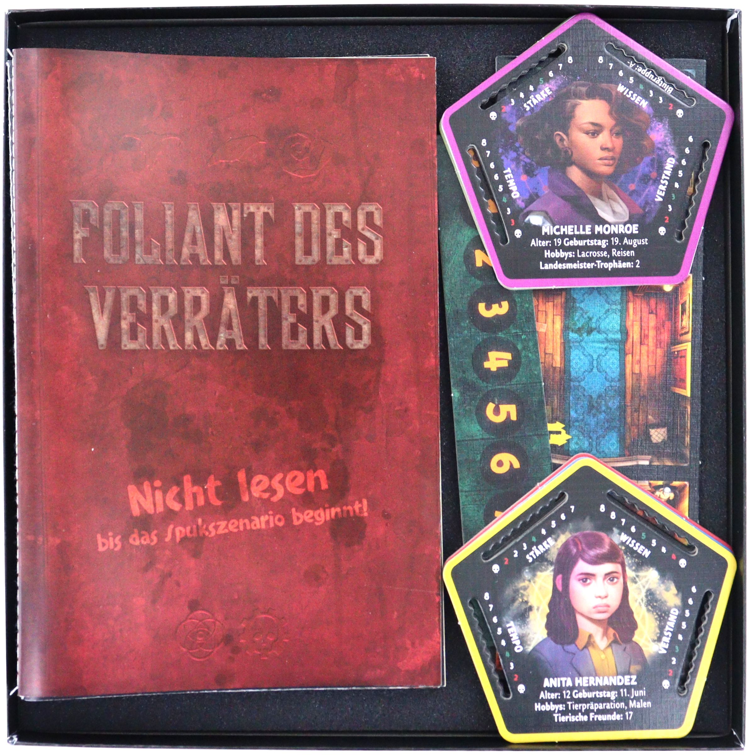 Regelheft, Foliant des Verräters, Überlebenshinweise, Startplättchen und die Zahlenleiste werden auf dem Schaumstoffdeckel aufbewahrt.