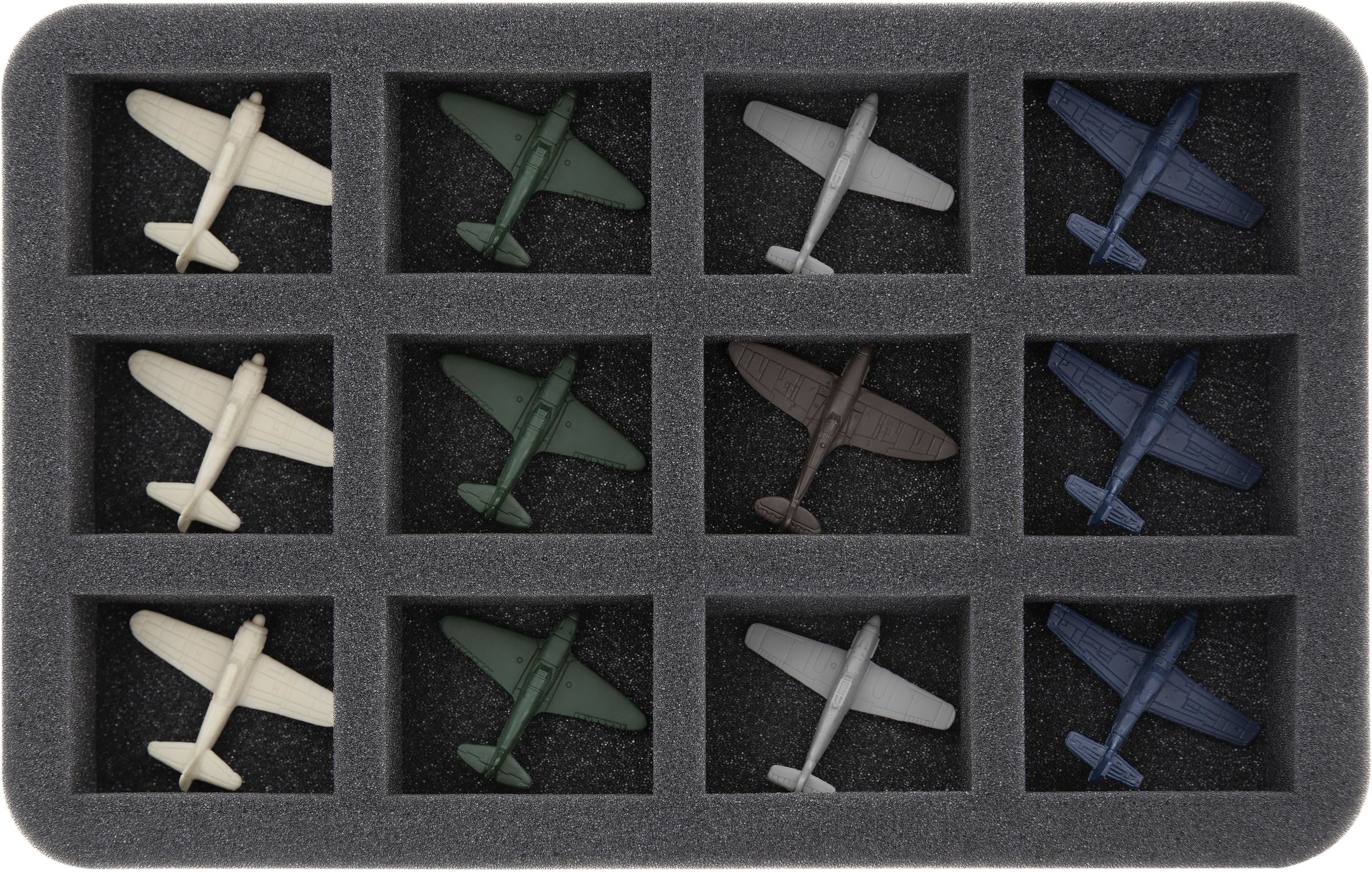 Diese Half-Size-Schaumstoffeinlage ist unterteilt in 12 Fächer gleicher Größe. In diese passen bis zu 12 Kampfflugzeuge ohne Flug-Base.