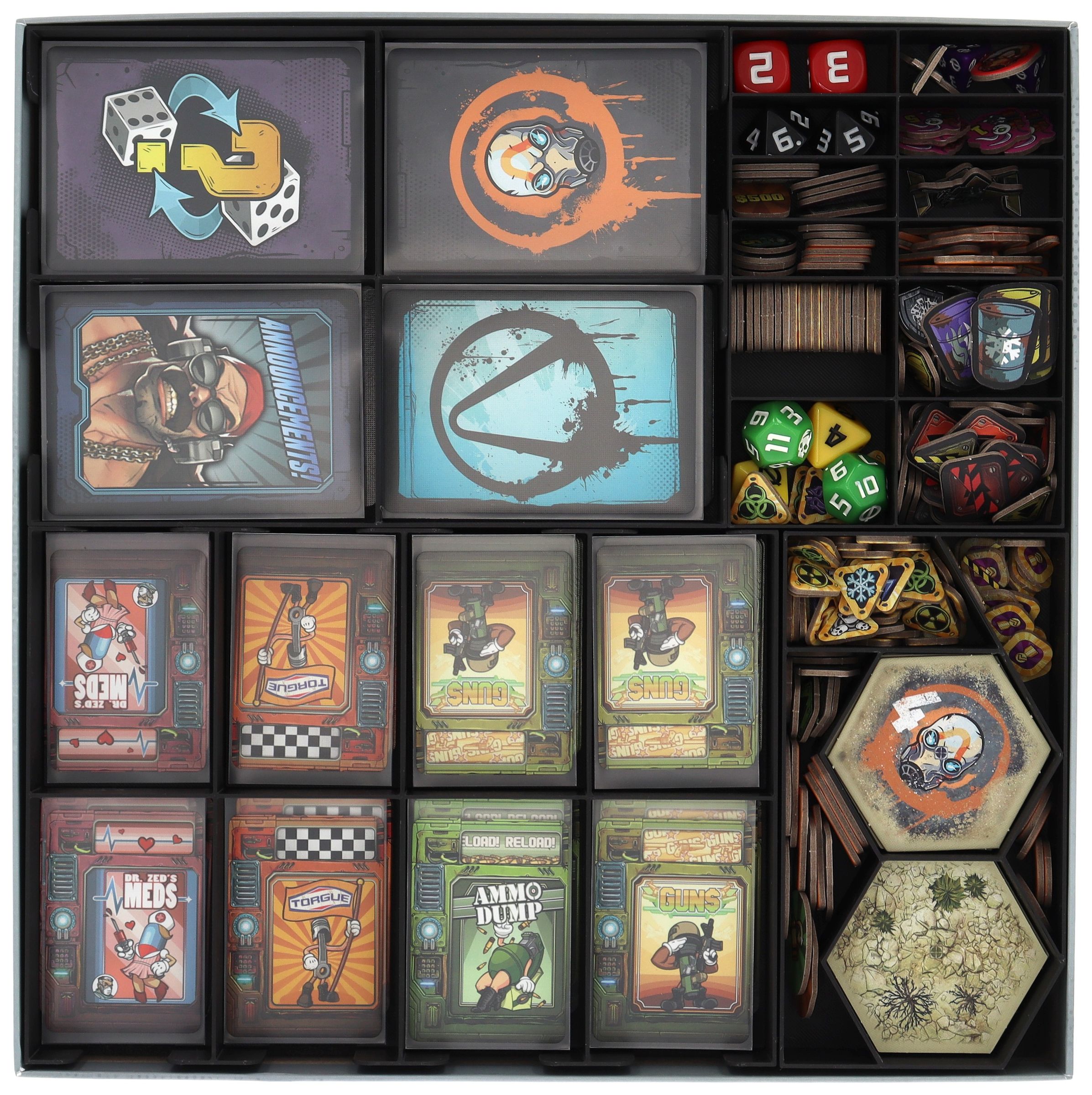 Willkommen in Borderlands. Hier regieren Knarren, Wummen und Kanonen. Damit deine Miniaturen inmitten des Kugelhagels nicht den Geist aufgeben, haben wir den passenden Organizer für deine Grundspielbox.