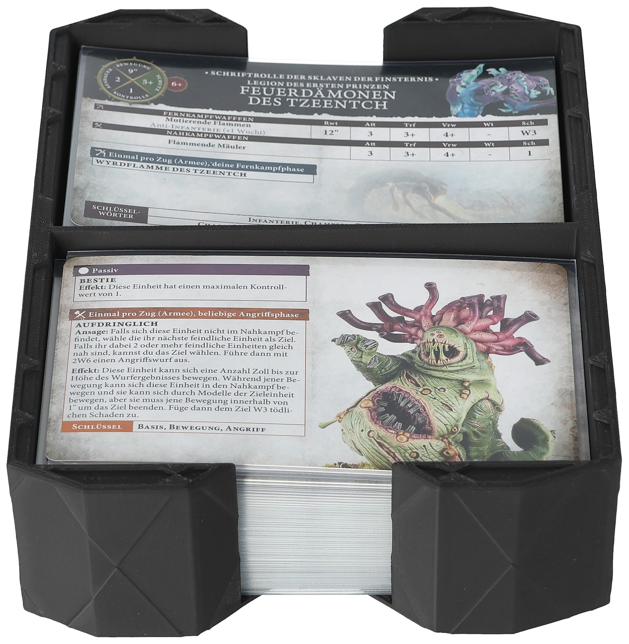 - Platz für bis zu 300 Karten ohne Schutzhüllen oder 150 Karten mit Sleeves - perfekt zum Sortieren, Transportieren und Bereitstellen deiner Warscroll Cards während des Spiels.