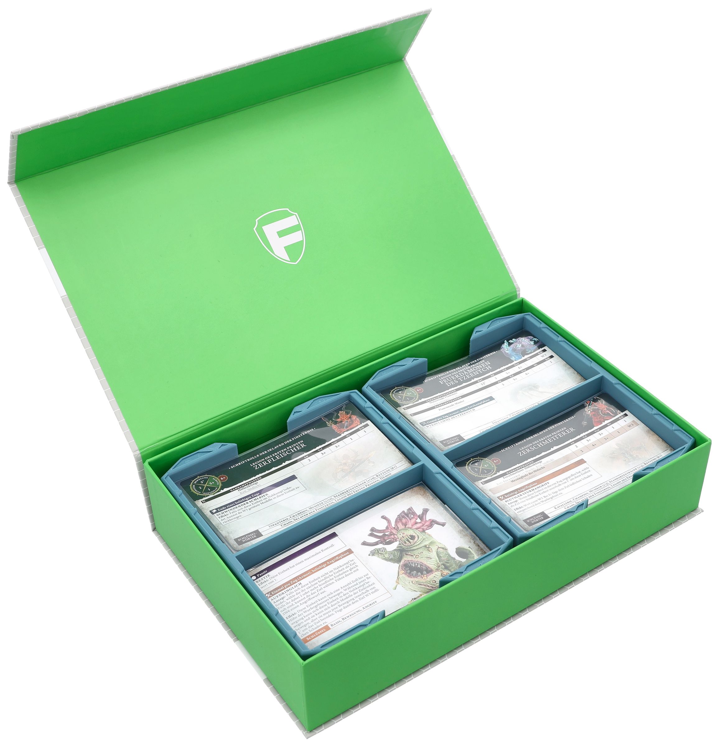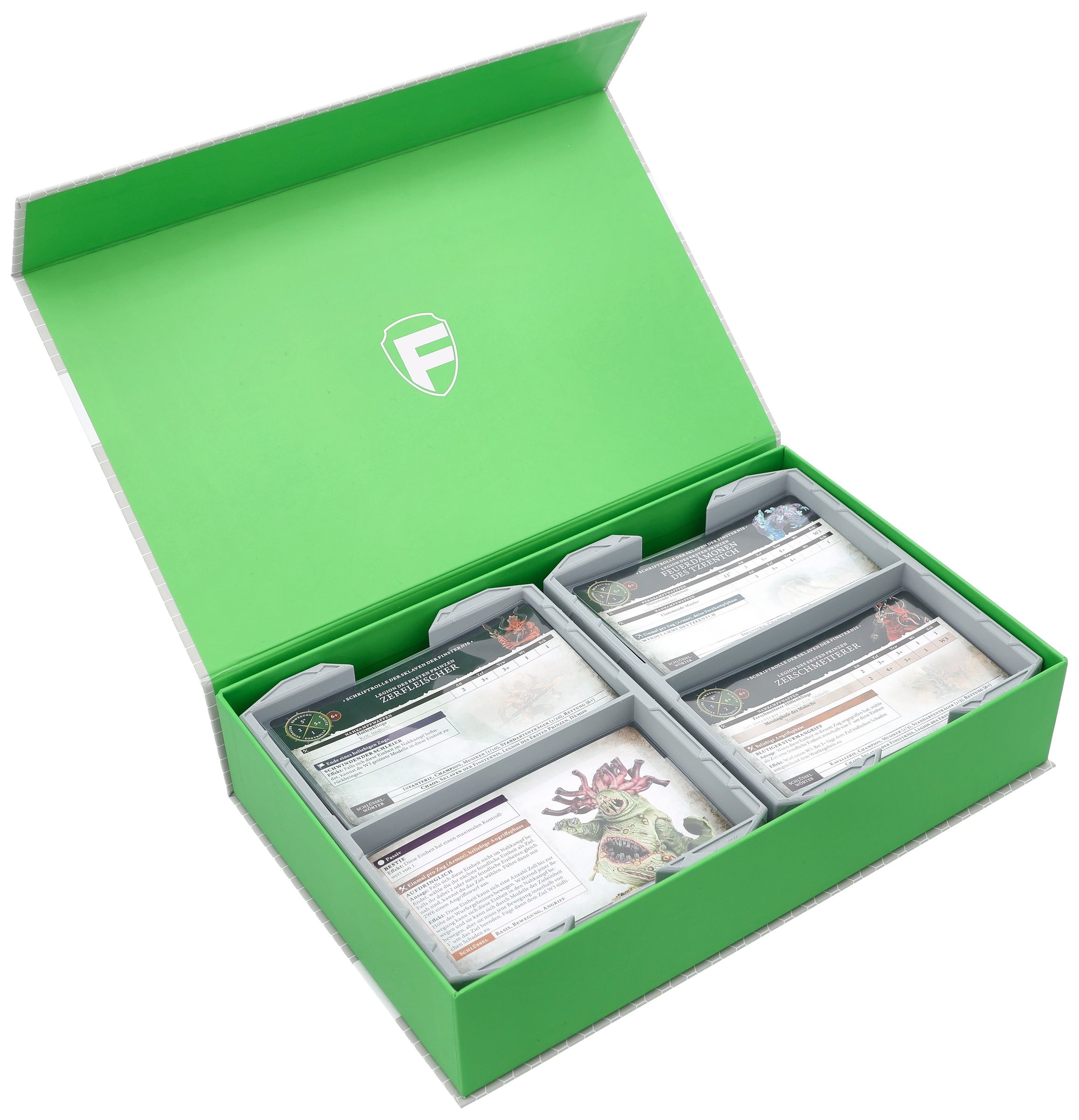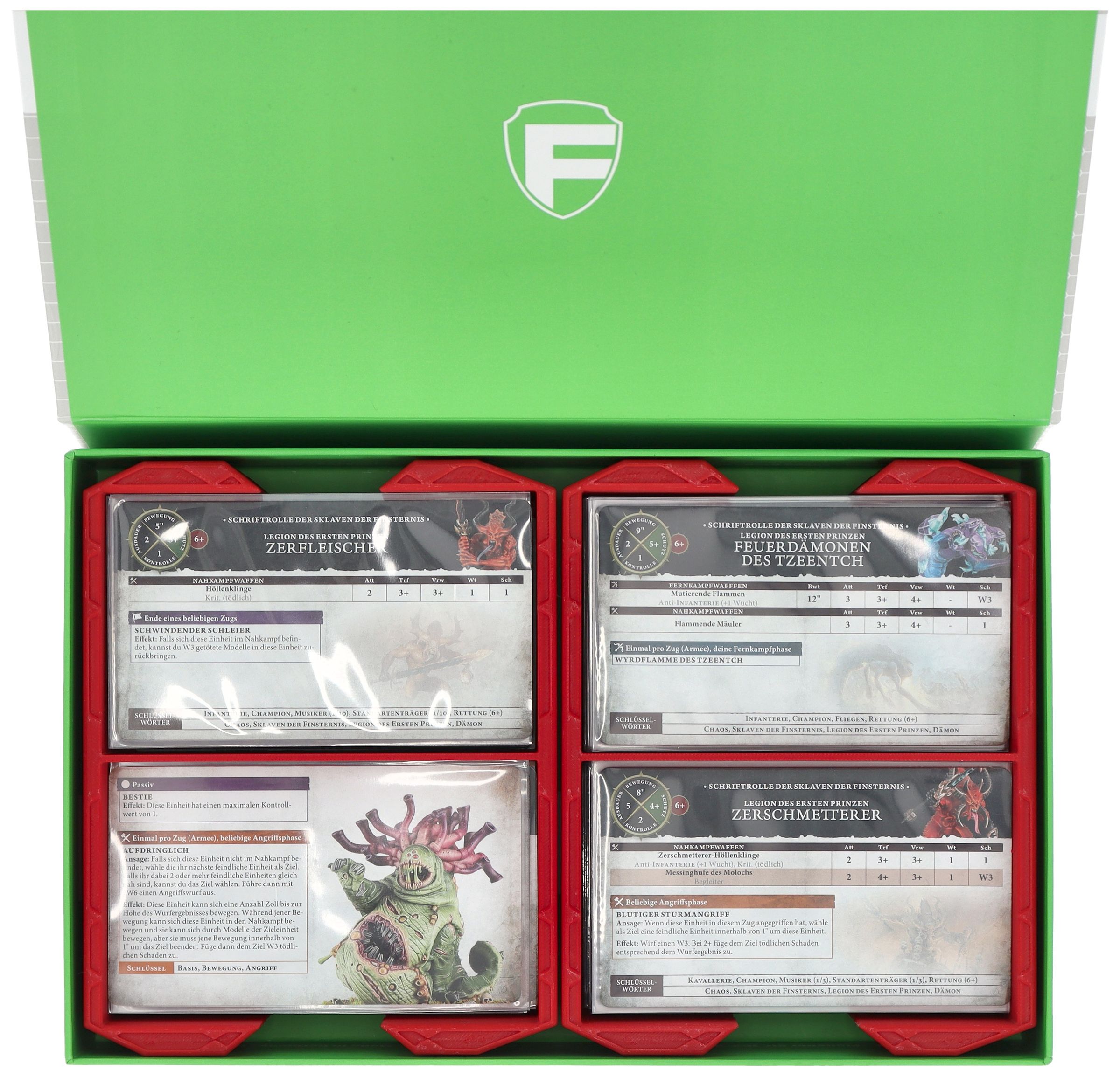 Die grüne Feldherr Magnetbox mit Kartenhalter-Insert ist die ideale Lösung, um deine Warhammer Age of Sigmar Schriftrollenkarten (Warscroll Cards) sicher und übersichtlich aufzubewahren. Mit dem passgenauen Kartenhalter hast du deine Karten ordentlich sortiert und jederzeit griffbereit - ob beim Transport oder ordentlich sortiert im Regal.