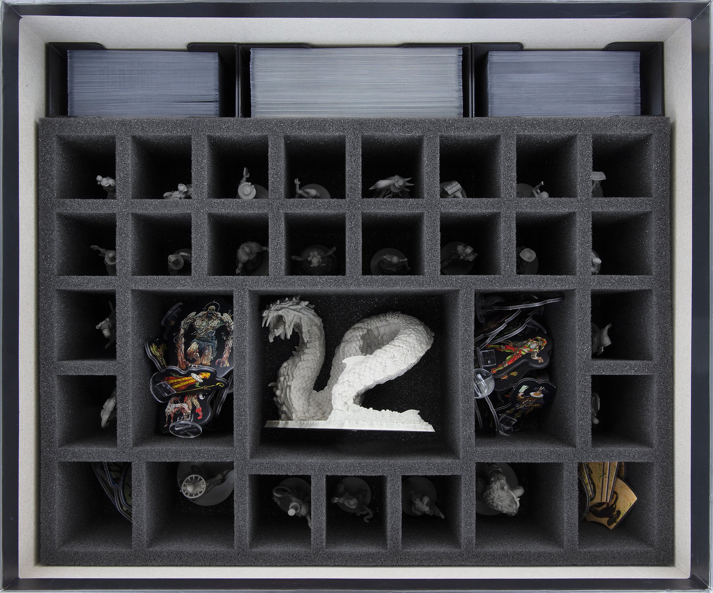 Egal ob einer der Überlebenden oder der riesige Tarantasio, jede Miniatur erhält ein passendes Fach. Dank des passgenauen Schnitts haben die Miniaturen einen festen Sitz. Selbst wenn du beim Transport über die Brücken Venedigs tanzt, verrutscht nichts und die Modelle verbleiben an ihrem Platz.