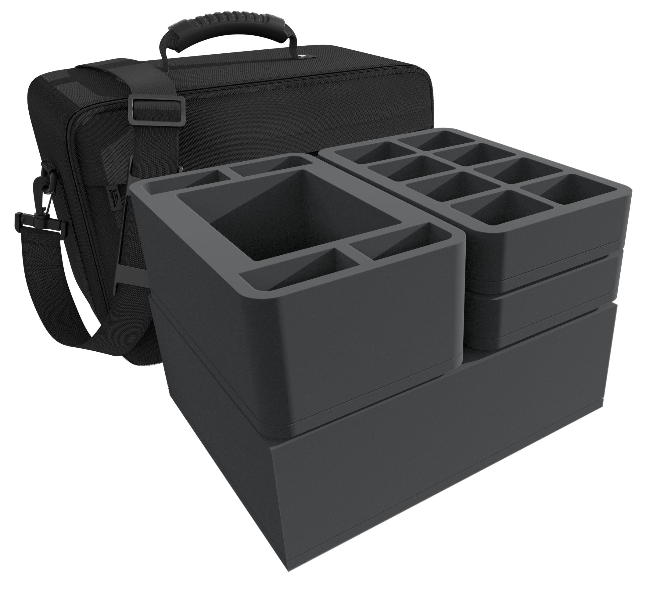 Natürlich passen die Einlagen exakt in die stabile MAXI PLUS-Tasche. Diese besteht aus besonders strapazierfähigem Material. Gepolsterte Seitenteile und ein verstärkter Boden sorgen zusätzlich dafür, dass deine Modelle auch beim Transport mit Auto oder Bahn bestens vor äußeren Einflüssen geschützt sind. Neben dem großen Hauptfach verfügt die Tasche über ein kleines Fach mit Reißverschluss an der Vorderseite. Auf der Oberseite befindet sich ein gummierter, handlicher Tragegriff. Wer die Hände lieber freihat, kann die Tasche dank des verschleißfesten, abnehmbaren Schultergurts auch bequem als Umhängetasche nutzen.