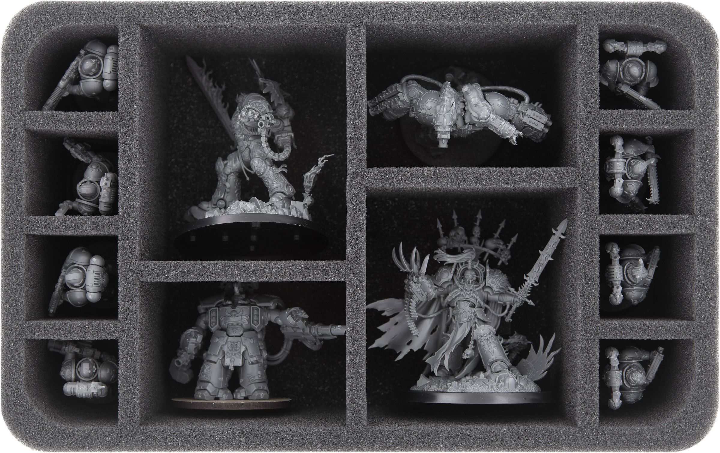 Die 12 Fächer auf dieser Half-Size-Schaumstoffeinlage teilen sich in drei verschiedene Größen. Das Insert eignet zum Aufbewahren und Transportieren von großen Charaktermodellen, als auch für Standard-Krieger auf 32 mm Bases.